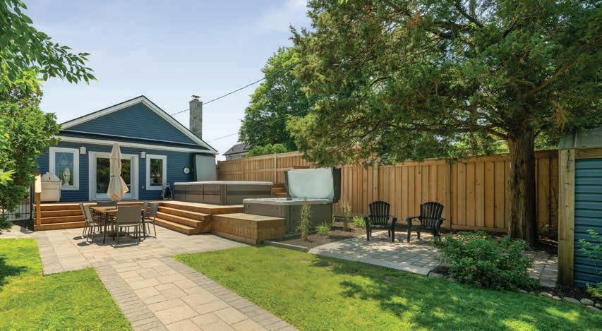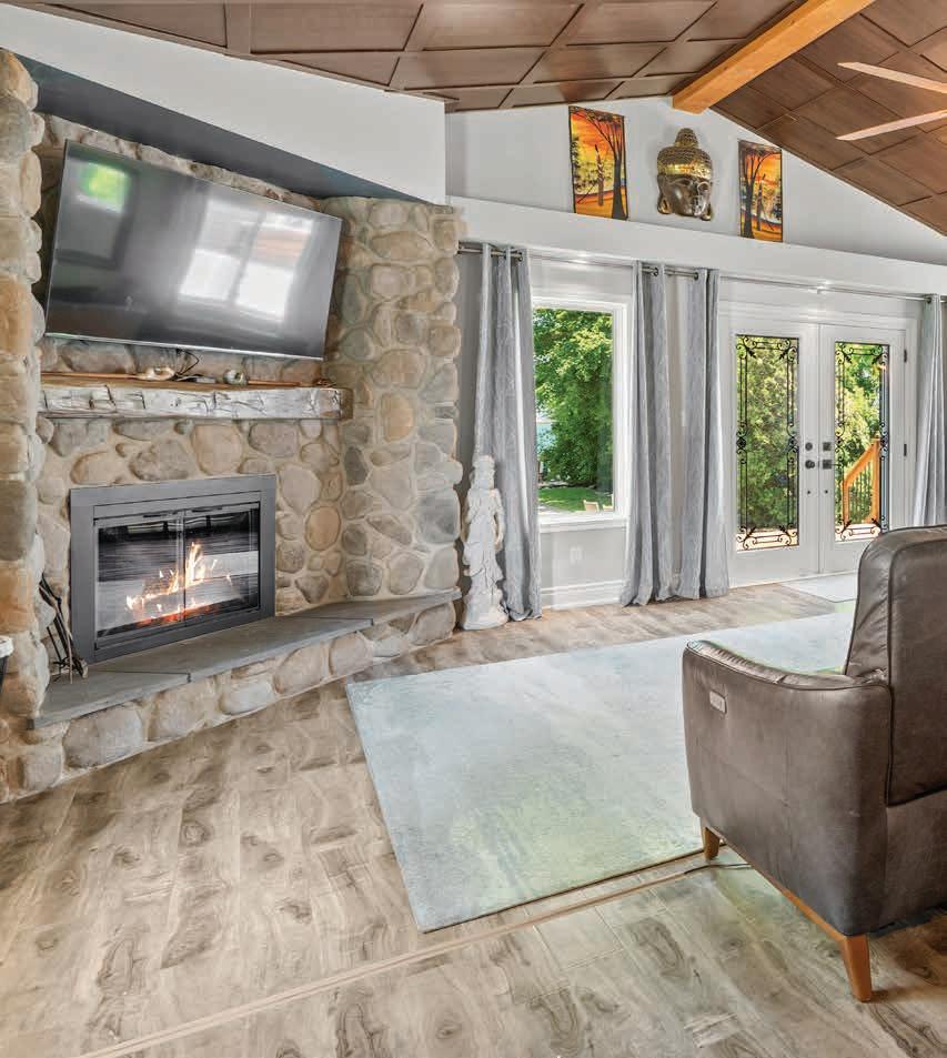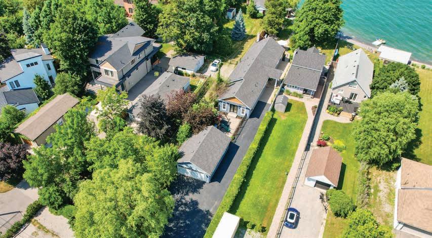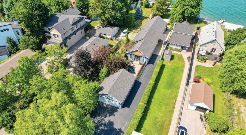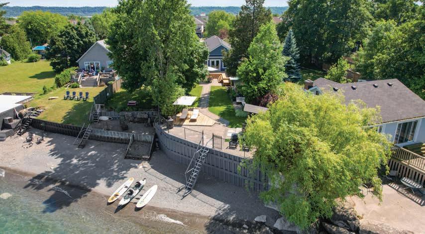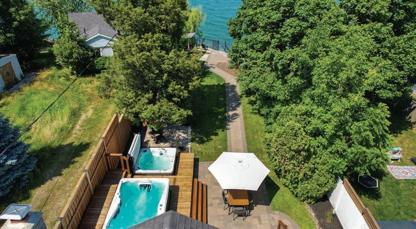 The Rear Gardens and Outdoor Living Area feature a fully-fenced perimeter, outdoor lighting, brand-new pressure-treated wood deck, swim spa and hot tub, interlock stone patios, outdoor bar, lush greenery and mature trees, two storage sheds, private sandy beachfront and undisturbed lakefront views.