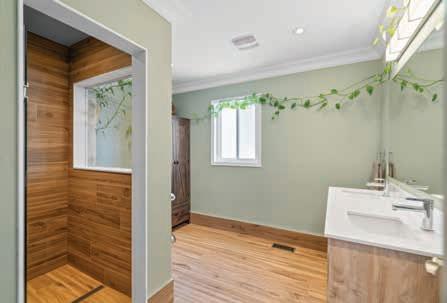 The 5-piece Hall Bathroom features crown moulding, potlights, vanity light fixture, woodgrained tile floor, vanity with double sink and large mirror, woodgrained tile shower with linear drain, window and glass door entry.