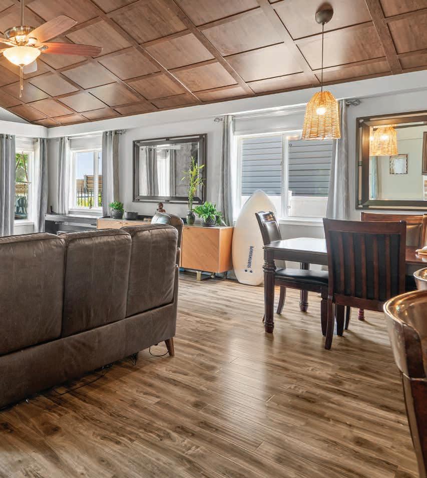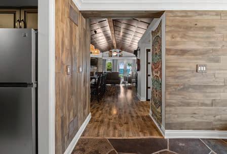 The Main Living Space features woodgrained laminate floors and soaring vaulted ceiling with central wood beam and coffered wood paneling detail surrounded by an art display ledge over the Gourmet Kitchen, Family Room and Dining Room.