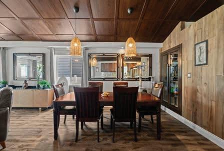 The open concept Dining Room features a built-in glass door display, wood panelling and pendant lighting.