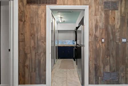 The newly-renovated 2-piece Powder Room, flanked by a storage closet and pantry just off the Main Living Space, features marble tile floor, crown moulding, vanity with sink and wall paper accent wall.