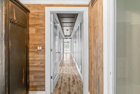 The Private Hallway off the Main Foyer provides access to all bedrooms, 5-Piece Hall Bathroom and Primary Suite. It features potlights inset in a custom woodtrimmed ceiling, woodgrained laminate floors, temperature controls and linen closet.