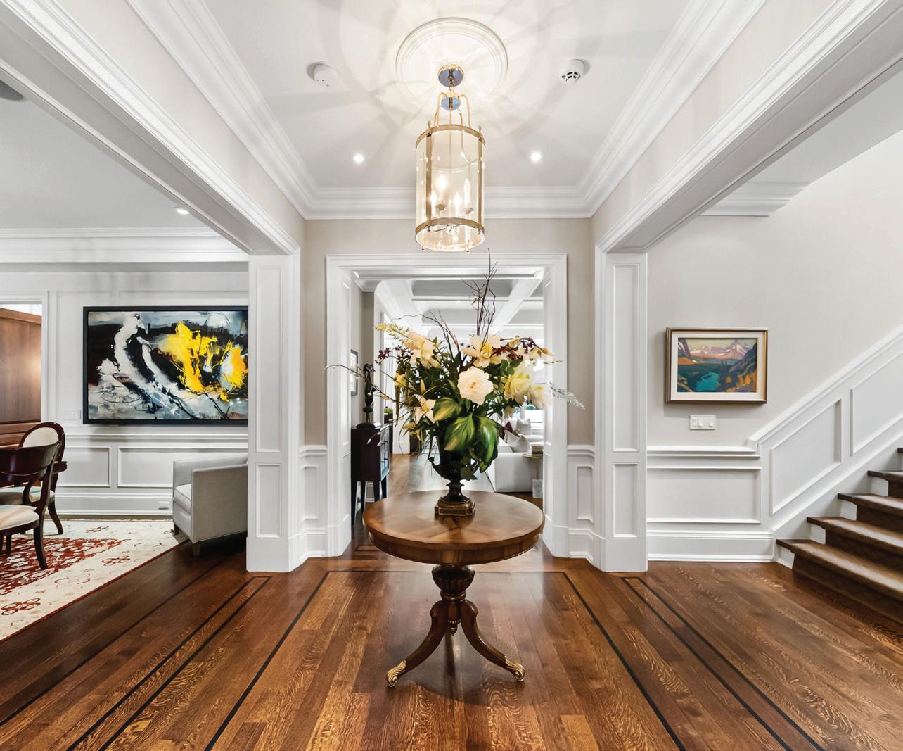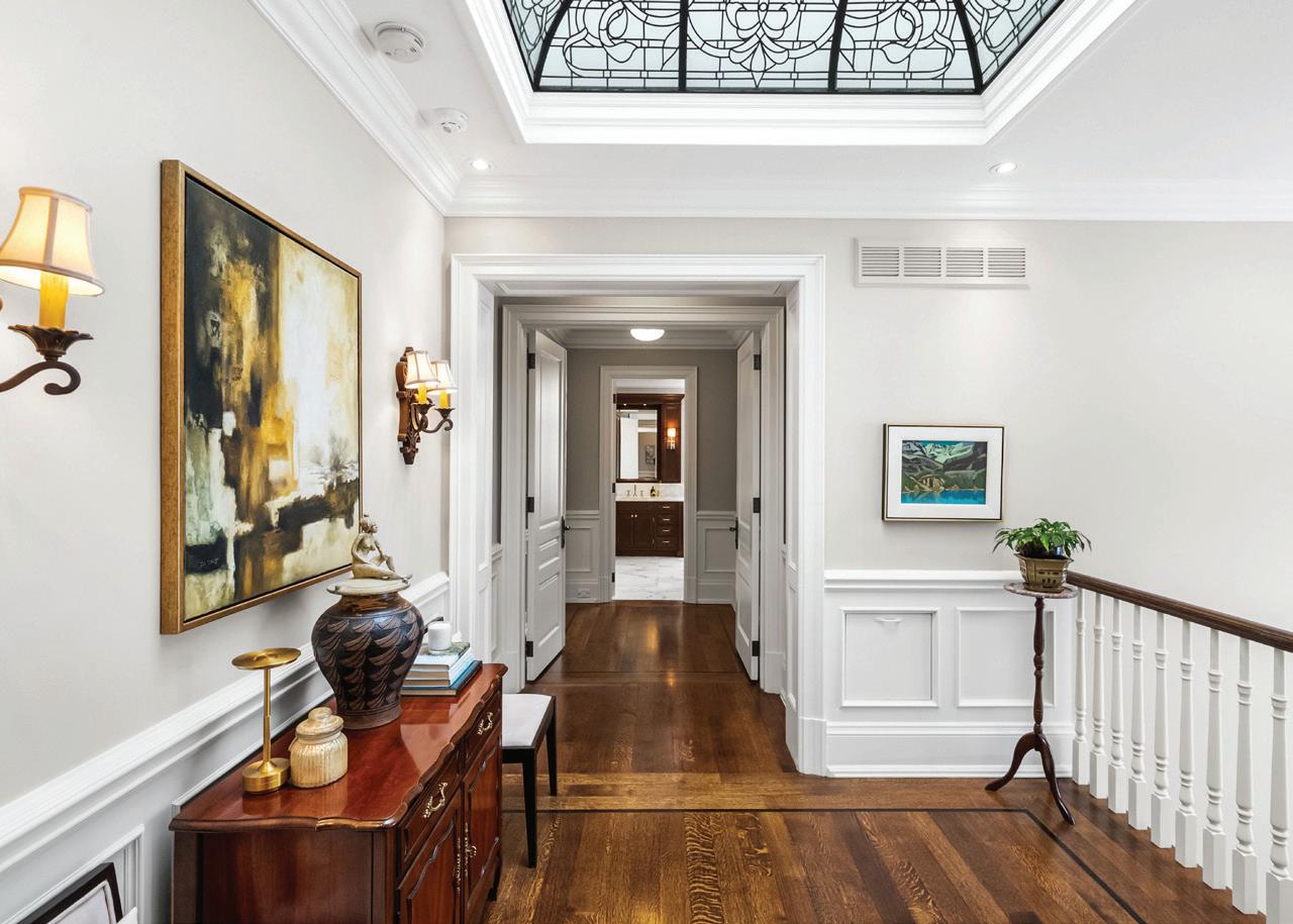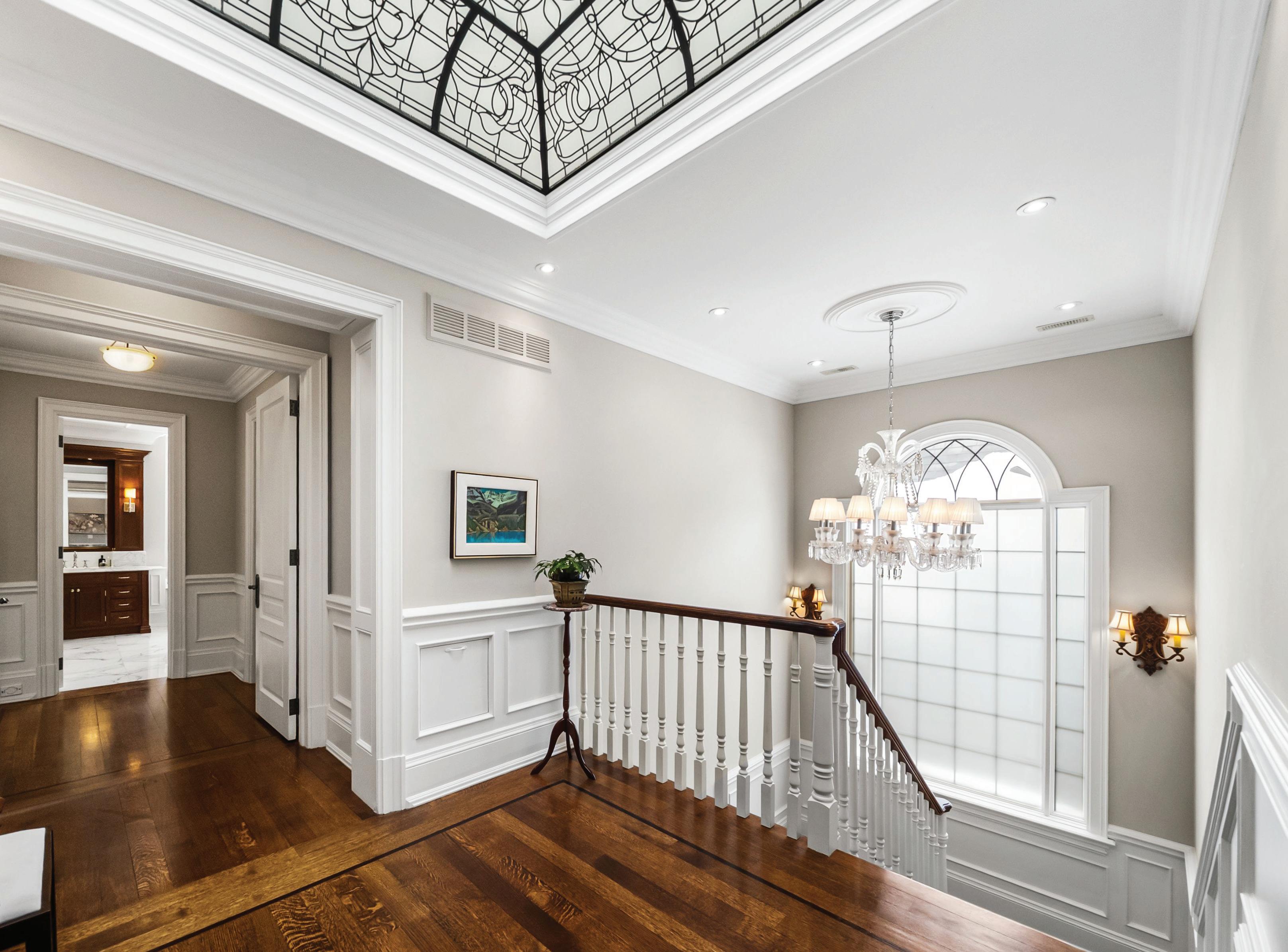 The lovely and grand 2 level staircase with landing features an impressive 5’6’’ x 10’ leaded glass window. At the top you are greeted by a 6’x6’ skylight with custom designed bevelled glass & iron overlay. Trim working under ramp and side of the stair, the whole hallway features wainscoting and cornice moulding and a double linen closet, quarter cut white oak with Wenge border, 9 ft. ceiling heights, heavy doors and heavy hardware, all water pipes are made of copper, pot lights, laundry chute.