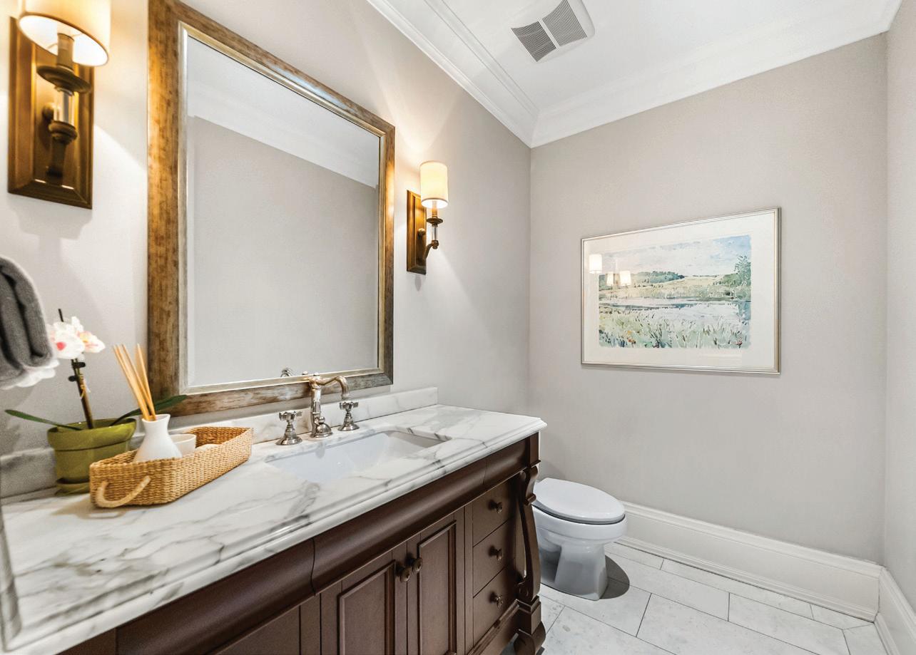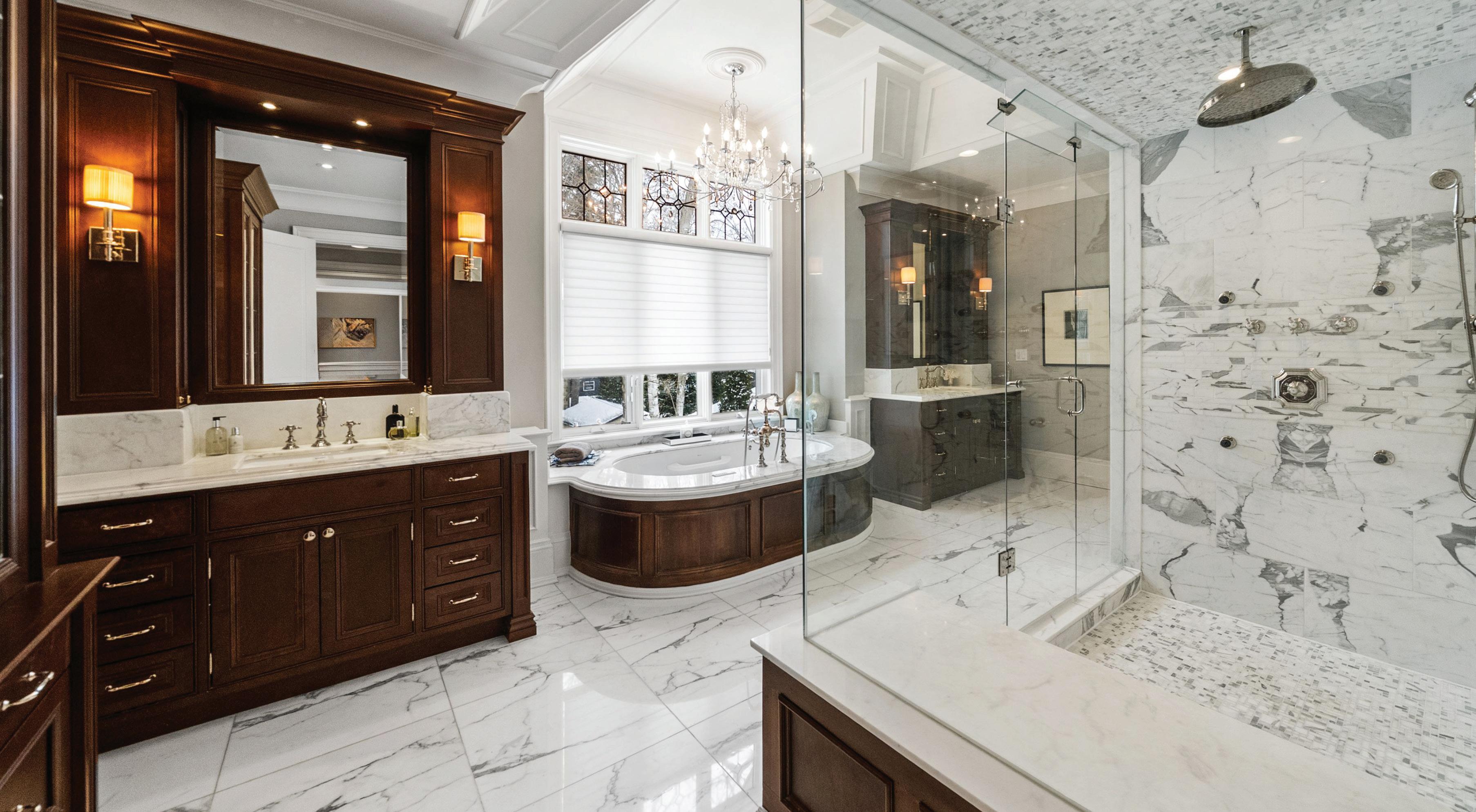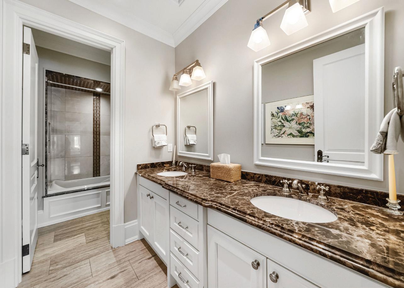 · Custom cabinetry with double sinks, marble countertops, double mirrors