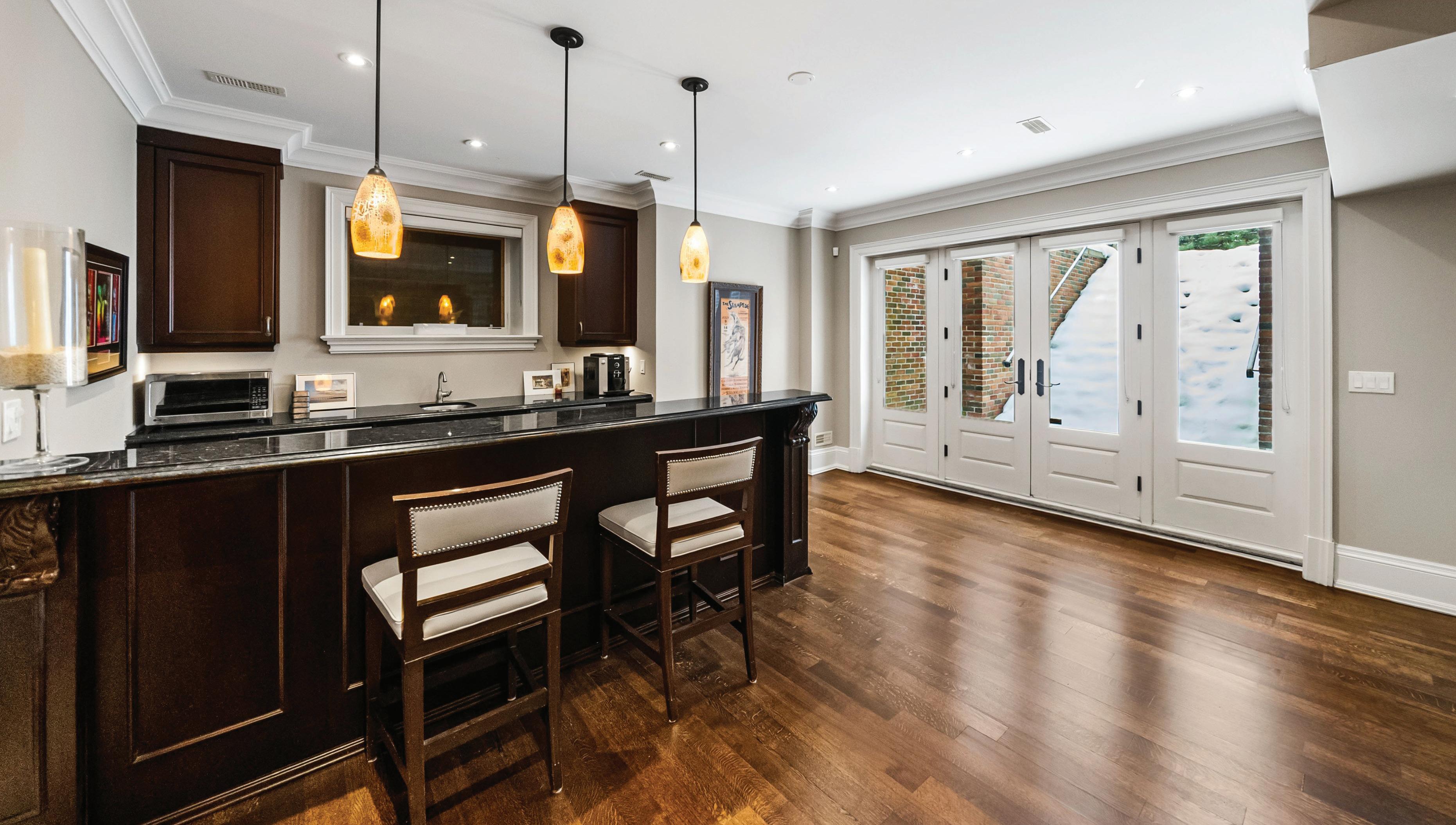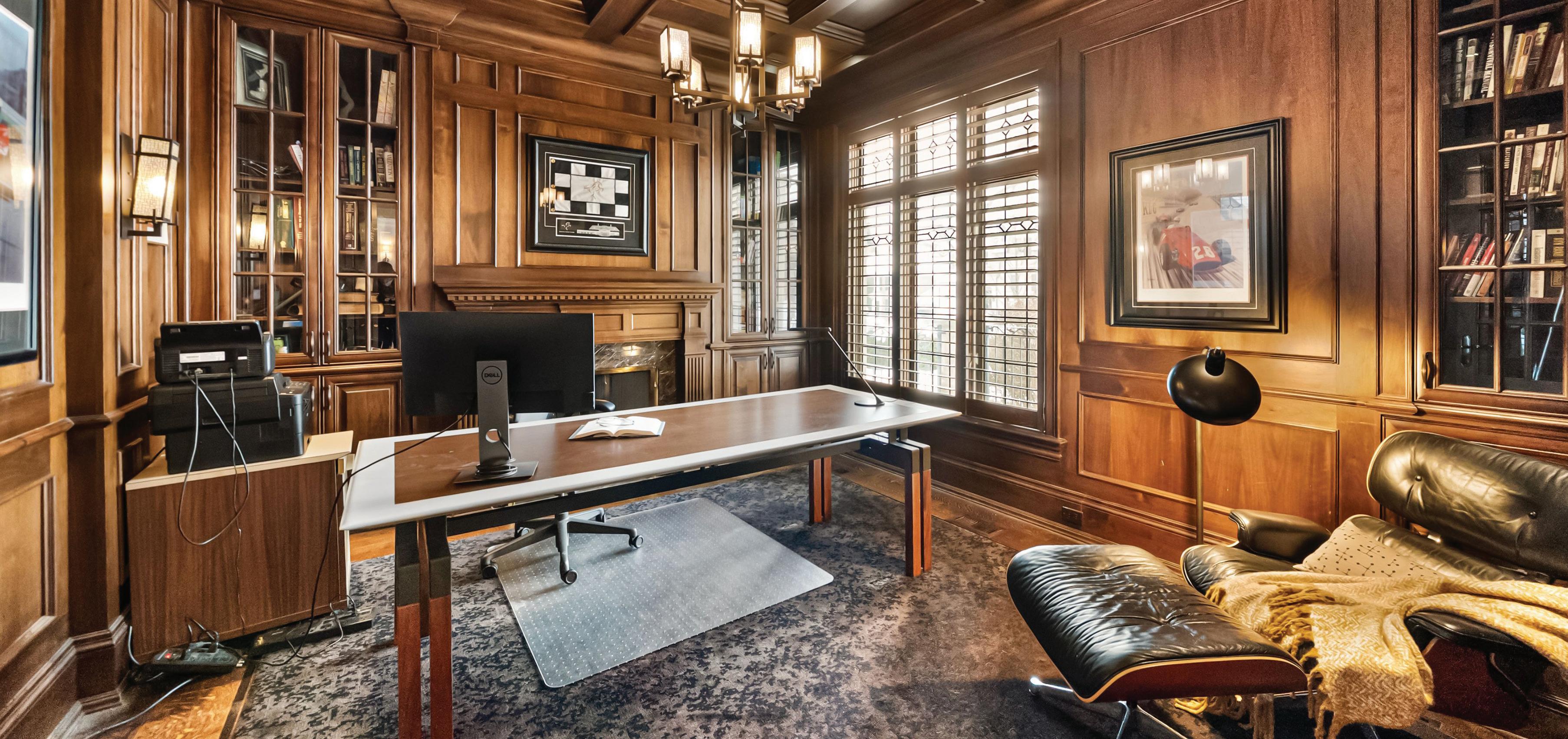 · Double door walk out to covered stone patio · Coffered ceiling, 11’7” ceiling heights