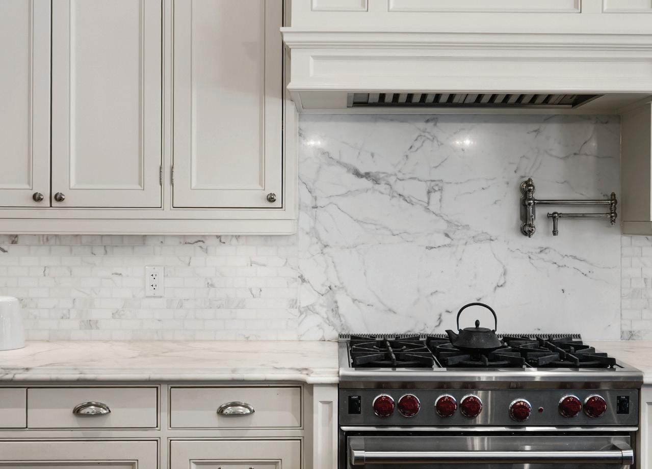 · Main centre island 5’ x 9’8’’ with Stattuario marble counter top and Stattuario back splash