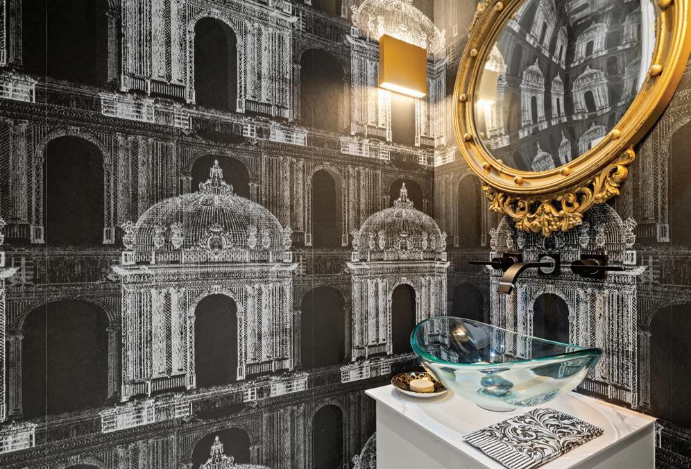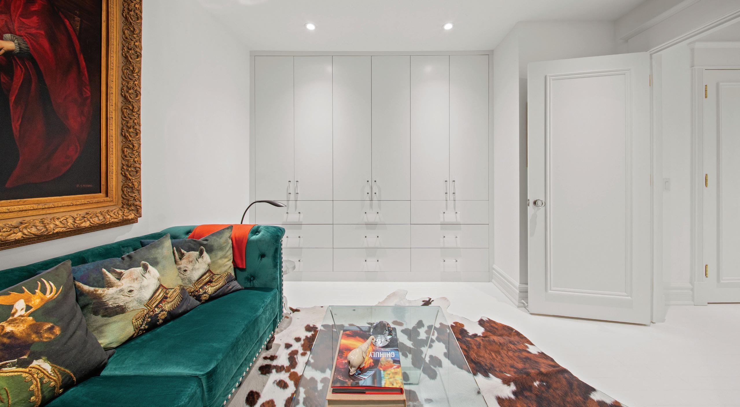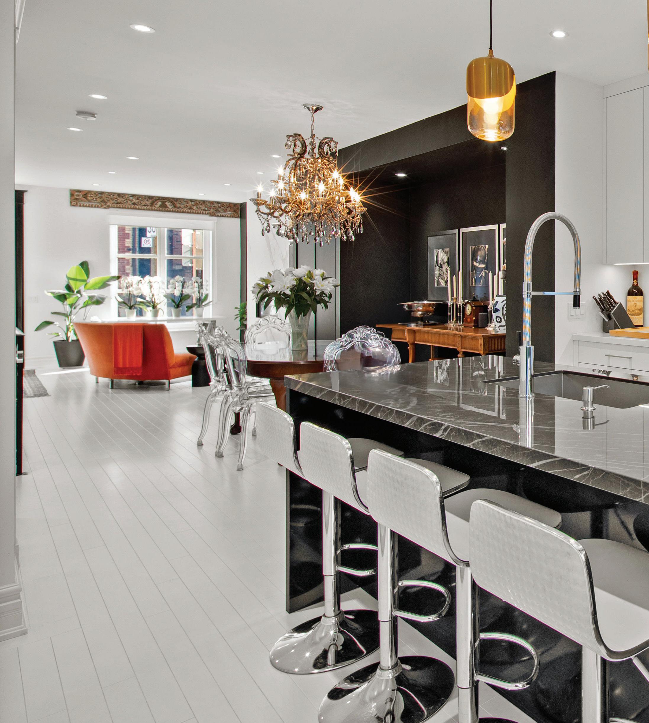 The chef’s kitchen has been designed for both form and function, anchored by a custom island topped in striking Sahara Noir quartzite. Full-height cabinetry with soft-close technology provides seamless storage, while premium stainless steel appliances cater to culinary enthusiasts. Brushed gold pendant lighting adds a layer of glamour, and sliding glass doors extend the space to the private rear courtyard for effortless indoor-outdoor entertaining.