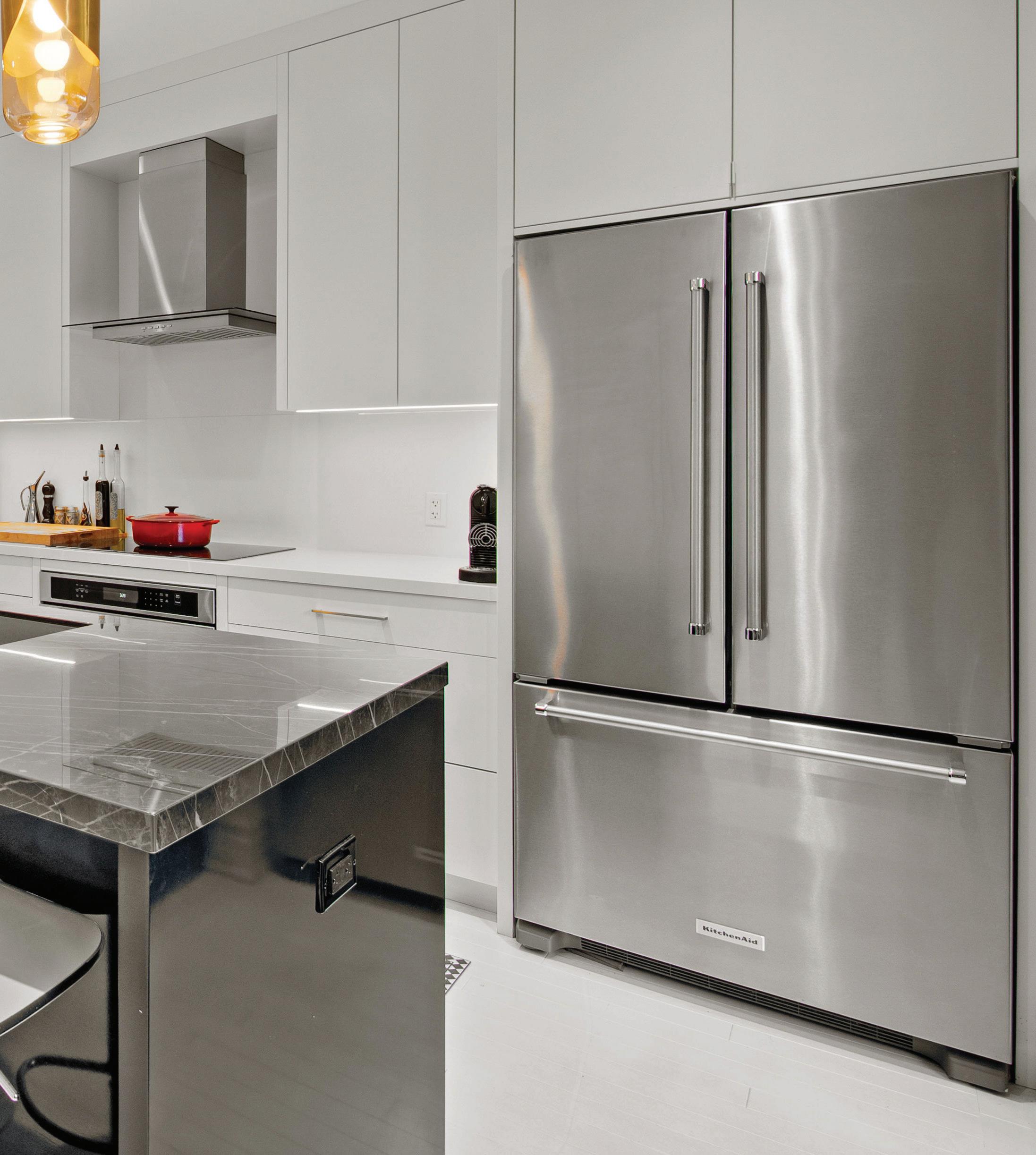 The open-concept living and dining area makes an unforgettable first impression. A dramatic floor-to-ceiling Bianco D’Italia porcelain feature wall with a sleek gas fireplace sets the stage for both everyday living and grand entertaining.