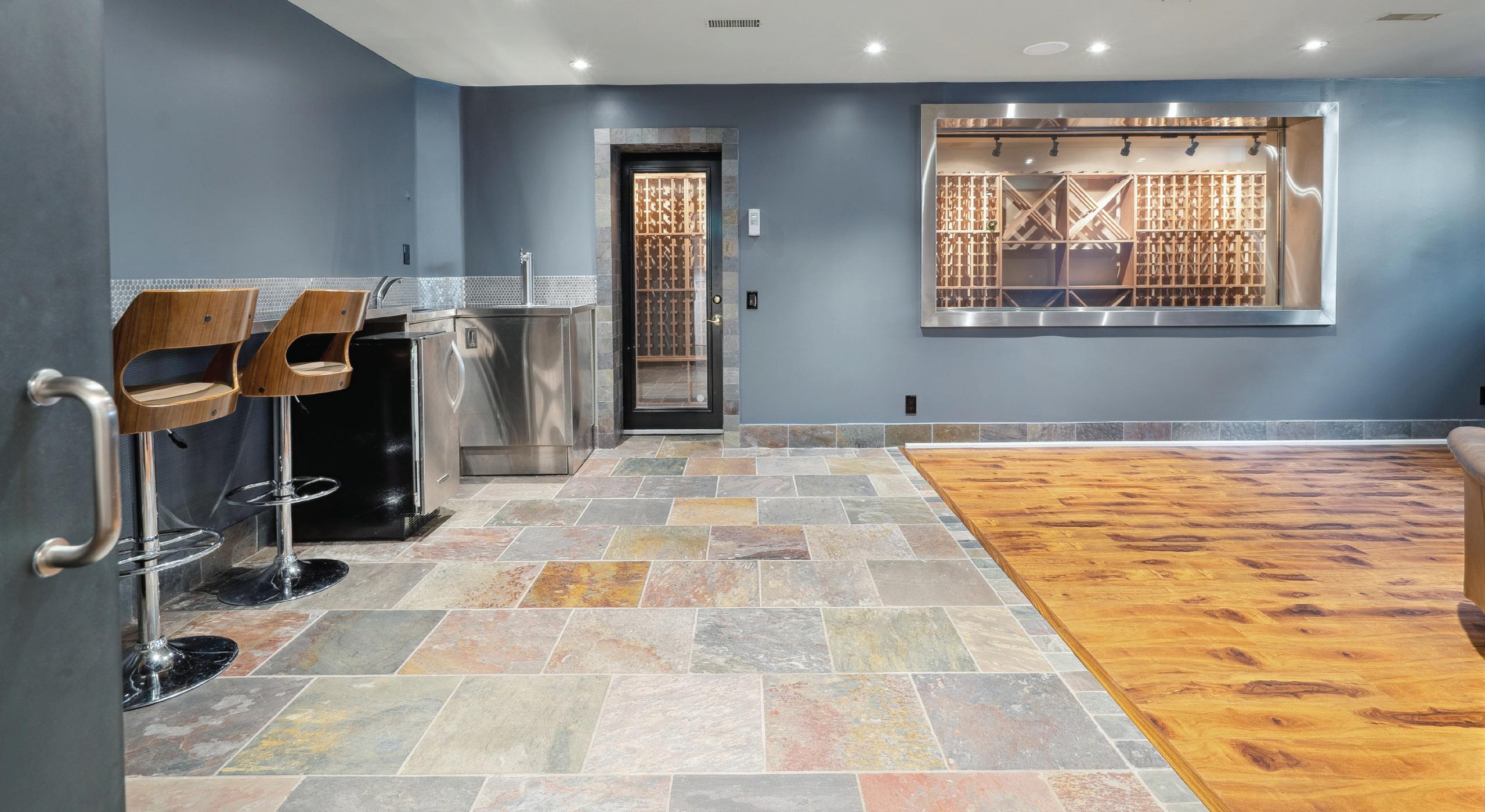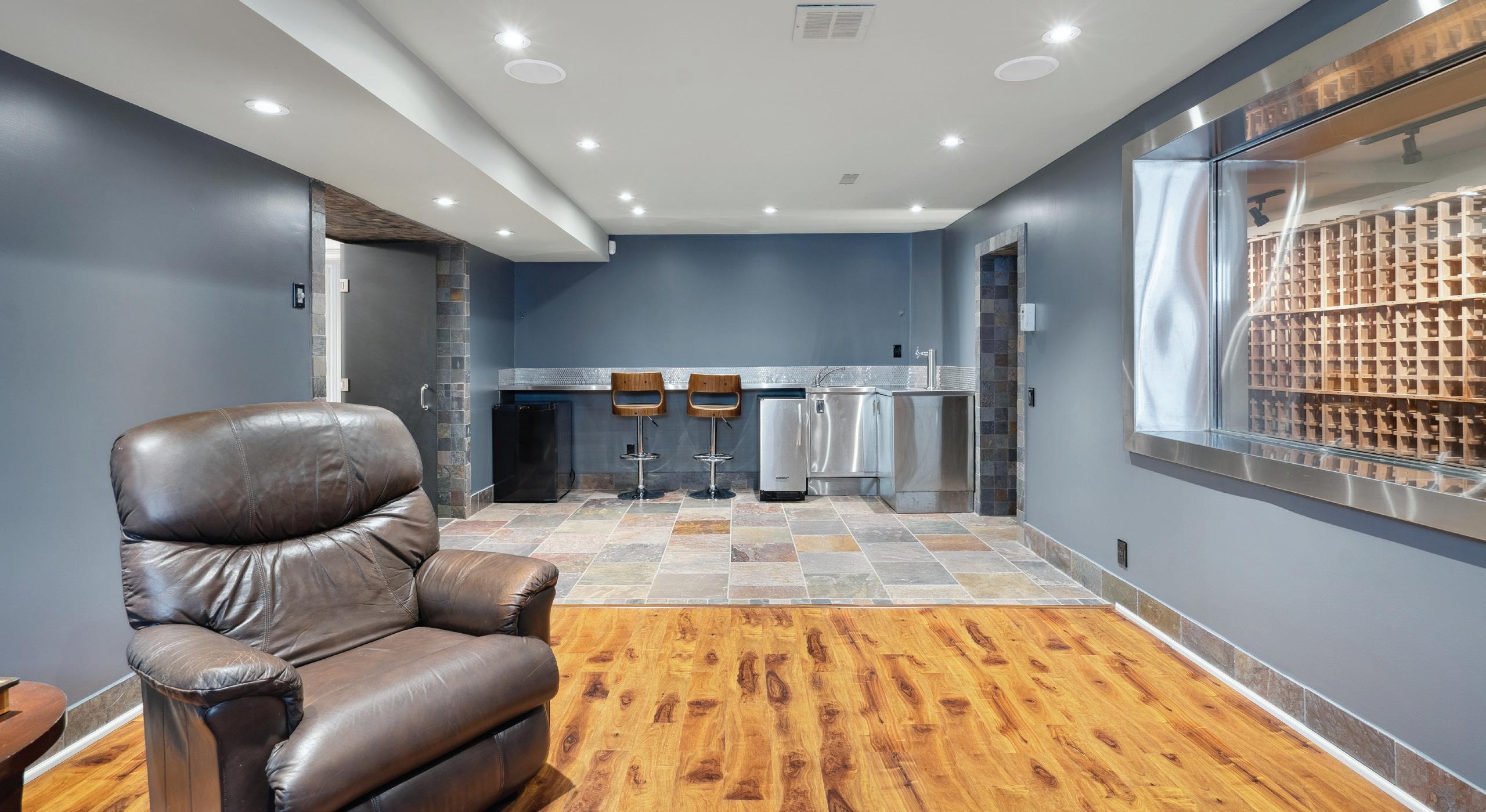 Well equipped for hosting and gathering, the entertainment room is appointed with a built-in keg fridge, KitchenAid ice maker, compact beverage fridge, bar seating, and a temperature-controlled walk-in wine cellar with capacity for nearly 800 bottles. The lounge area is finished with laminate and stone floors, LED pot lights, in-ceiling speakers, and above-grade windows.