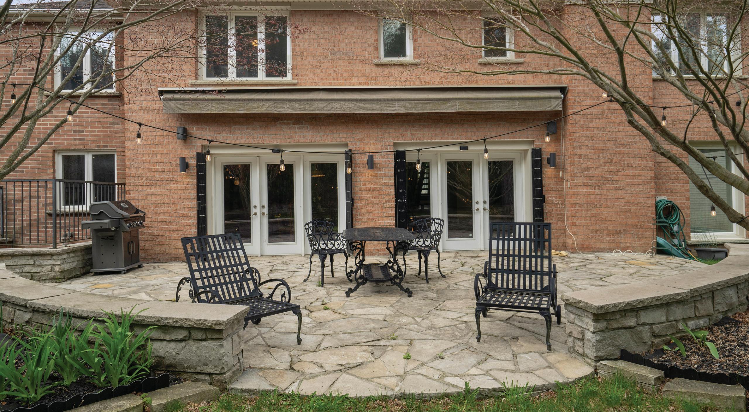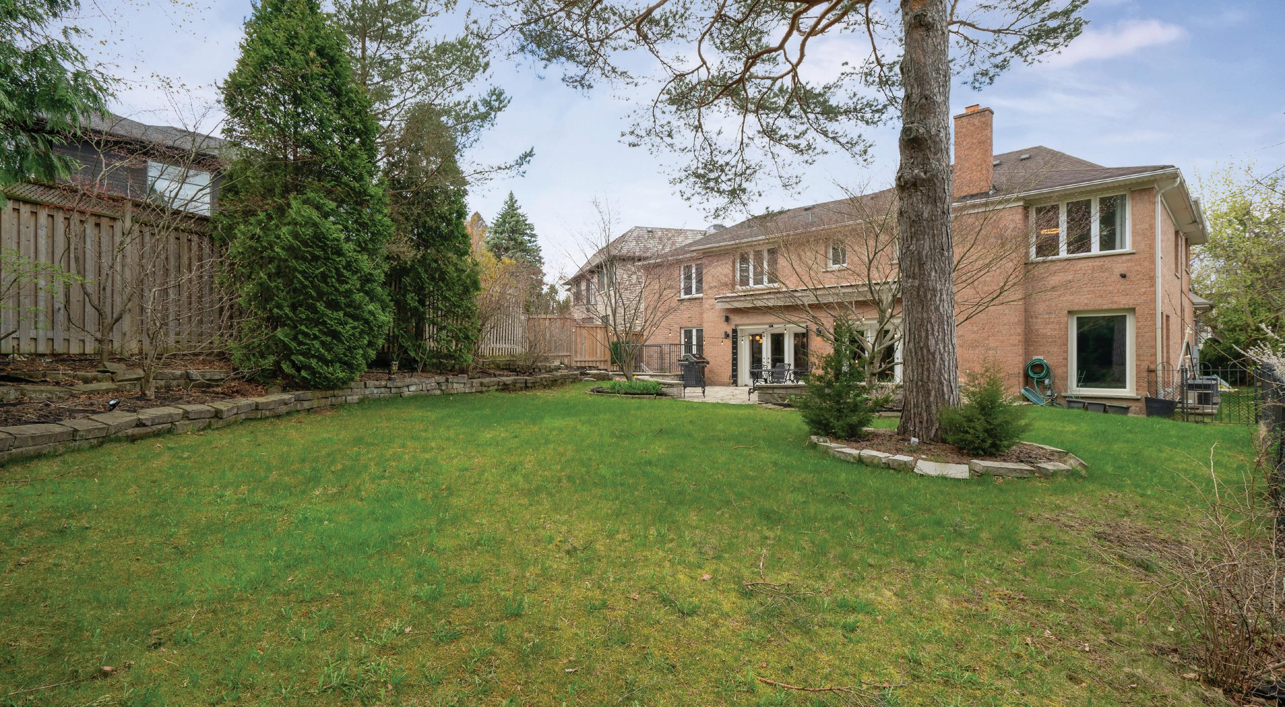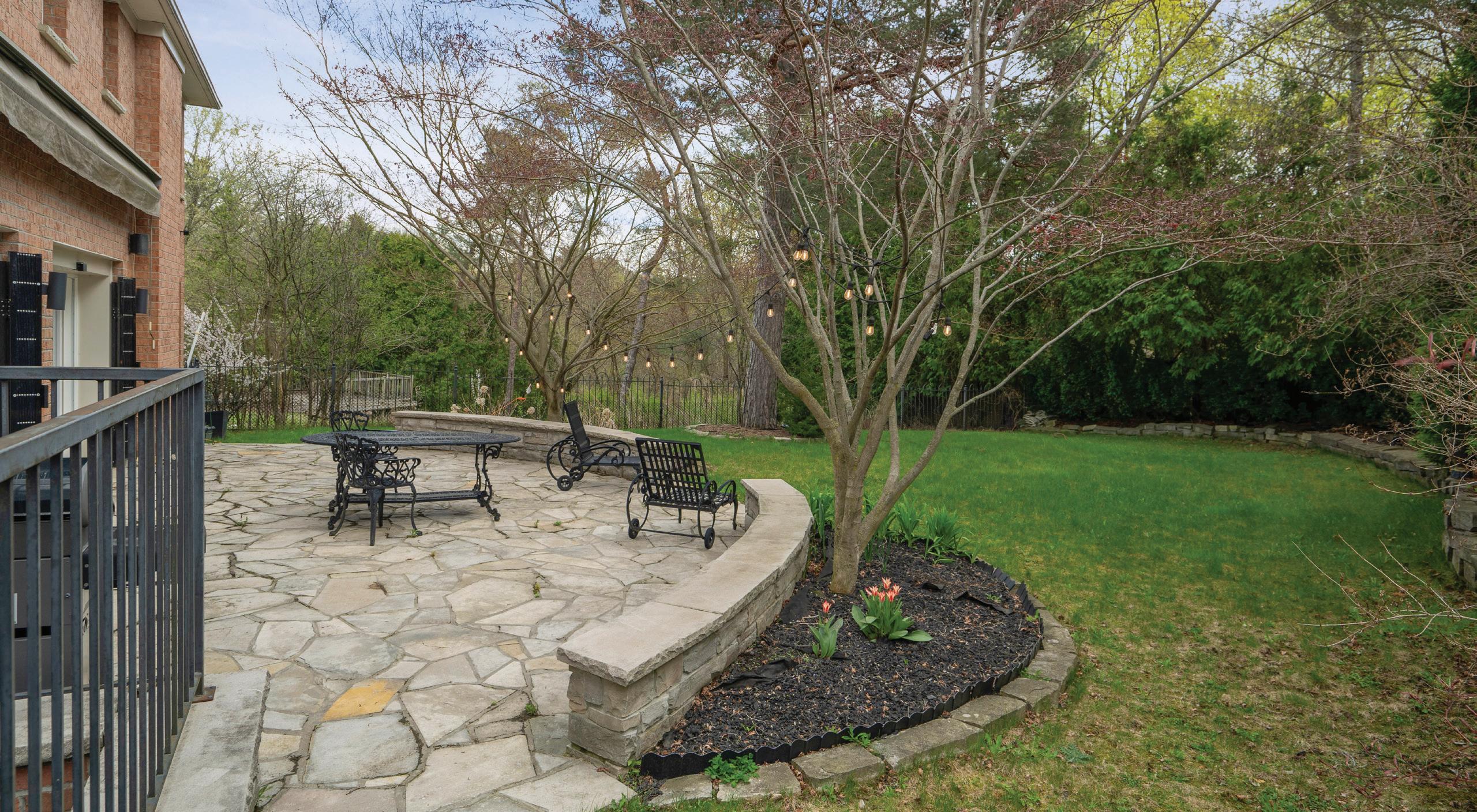 Framed by mature evergreen trees and soaring hedges, the backyard is secluded and naturally sheltered from outside noise. It features diverse landscaping and lush perennial gardens, open green space, a barbecue-ready flagstone terrace with a retractable sun shade, outdoor speakers, and automatic landscape lighting.