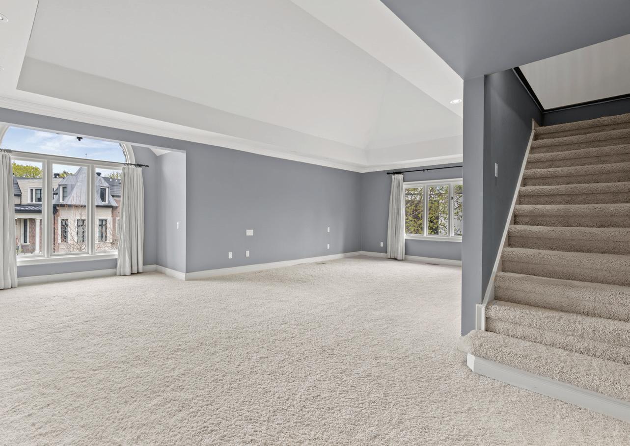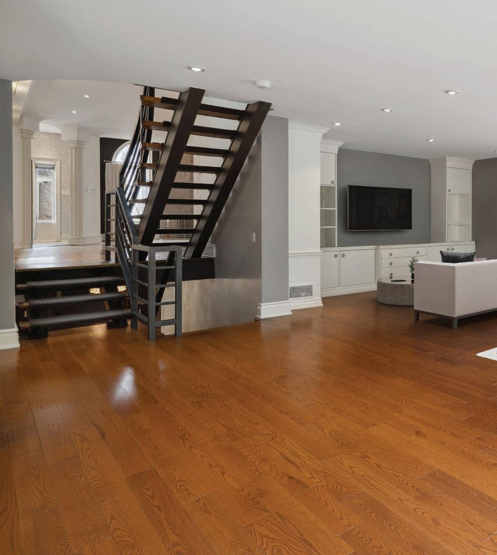 The recreation room offers generous scale for lounging, games, or guest accommodations. It features a walk-up entrance to the backyard, heated laminate floors, LED light fixtures, and a double closet.