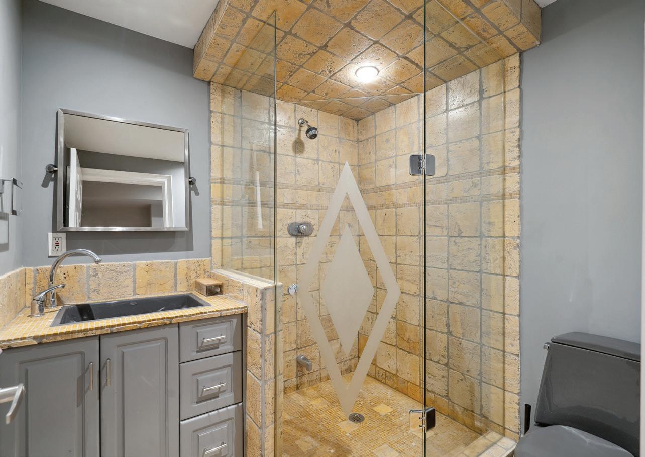 Positioned between the exercise room and entertainment room, the three-piece bathroom has a glass-enclosed shower with tile surround, built-in vanity with storage and an undermount sink, and pot lights.