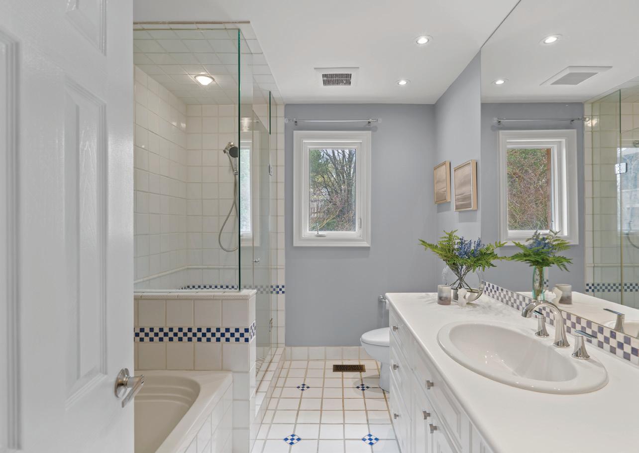 The shared bathroom has a seamless glass enclosed shower, separate tub, built-in vanity with an undermount sink and lower cabinets, casement window, built-in mirror, and LED pot lights.