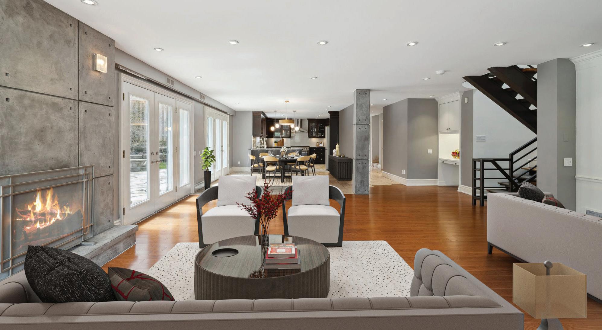 The family room enjoys seamless indooroutdoor living with a glass door walkout to the rear gardens, as well as floor-to-ceiling windows overlooking the lush grounds. The family room is complete with hardwood floors, a wood-burning fireplace with custom surround, built-in entertainment unit with cabinets and open shelves, and LED pot lights.