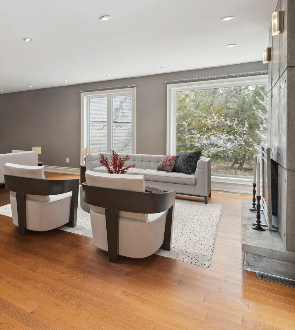 The expansive living room features a gas fireplace with full-height surround, custom floor-to-ceiling windows with drapery overlooking the front gardens, hardwood floors, crown moulding, pot lights, and a wall-mounted display shelf.