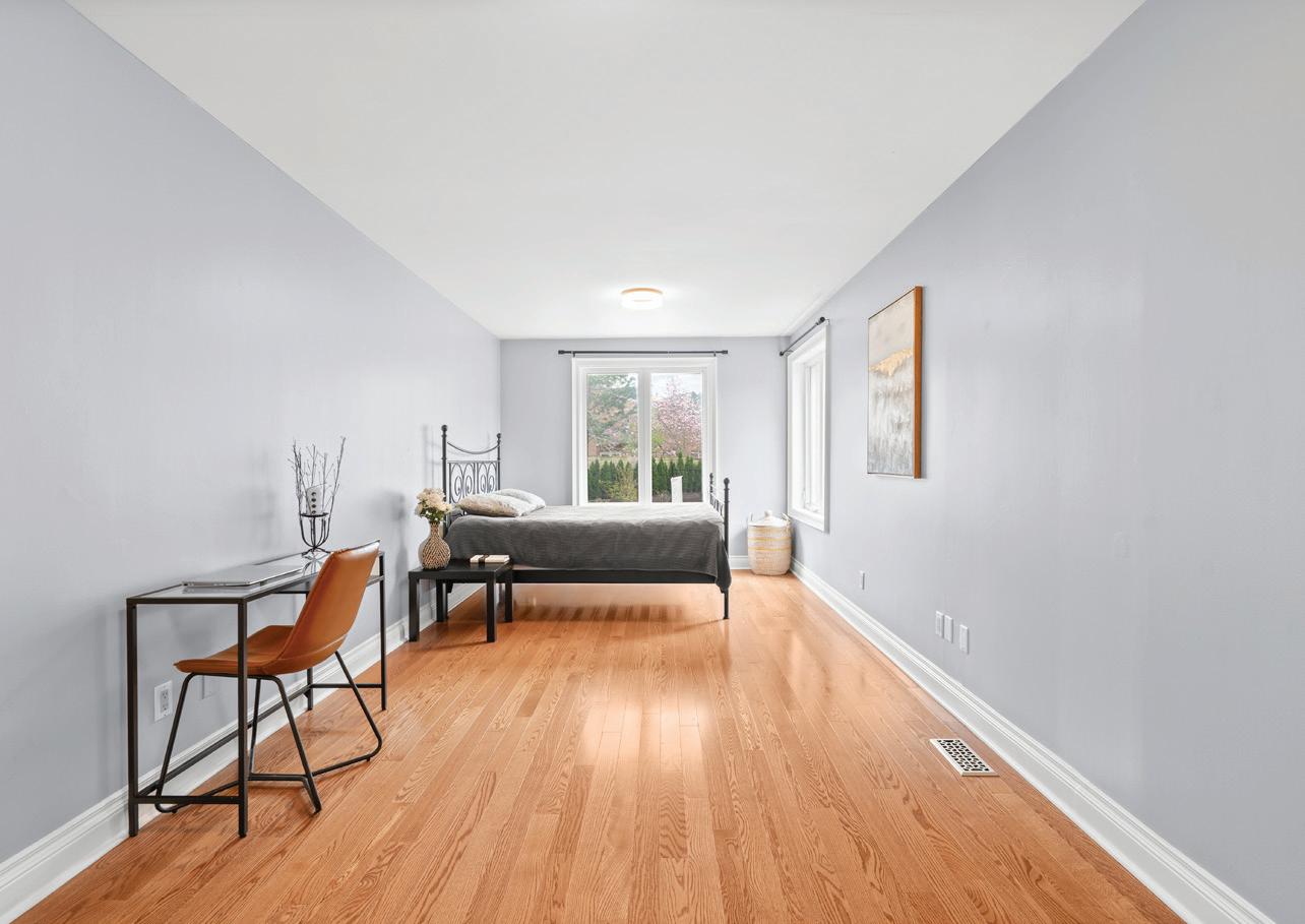 The third bedroom enjoys abundant natural light with oversized windows facing the rear gardens, wood floors, a central light fixture, and convenient four-piece ensuite.