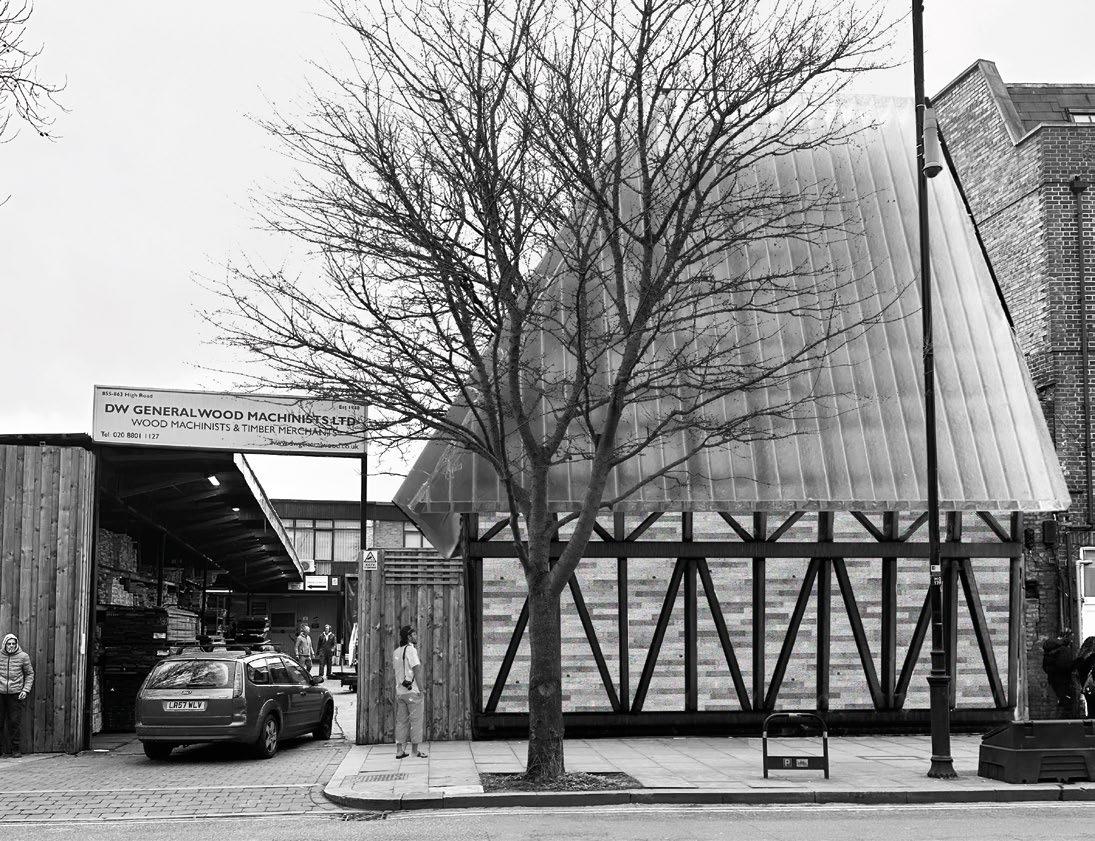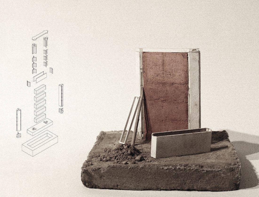 2.1, 2.22–2.23 Aryan Kaul, Y2 ‘The Meanwhile Repair Collective’. In collaboration with Meanwhile Gardens Community Association, this project addresses a collapsing factory building through a self-build scheme. It rehabilitates existing spaces, such as offices, storage, workshops and meeting areas, and fosters social cohesion. Interviews, tours and volunteering inform the design process. Drawing inspiration from a Moroccan self-build practice, the project explores rammed earth construction in London and incorporates recycled materials. Digital fabrication simplifies construction, using timber columns for both structure and formwork. The incremental development process respects the site’s self-build community, minimising interruptions and preserving usable spaces.