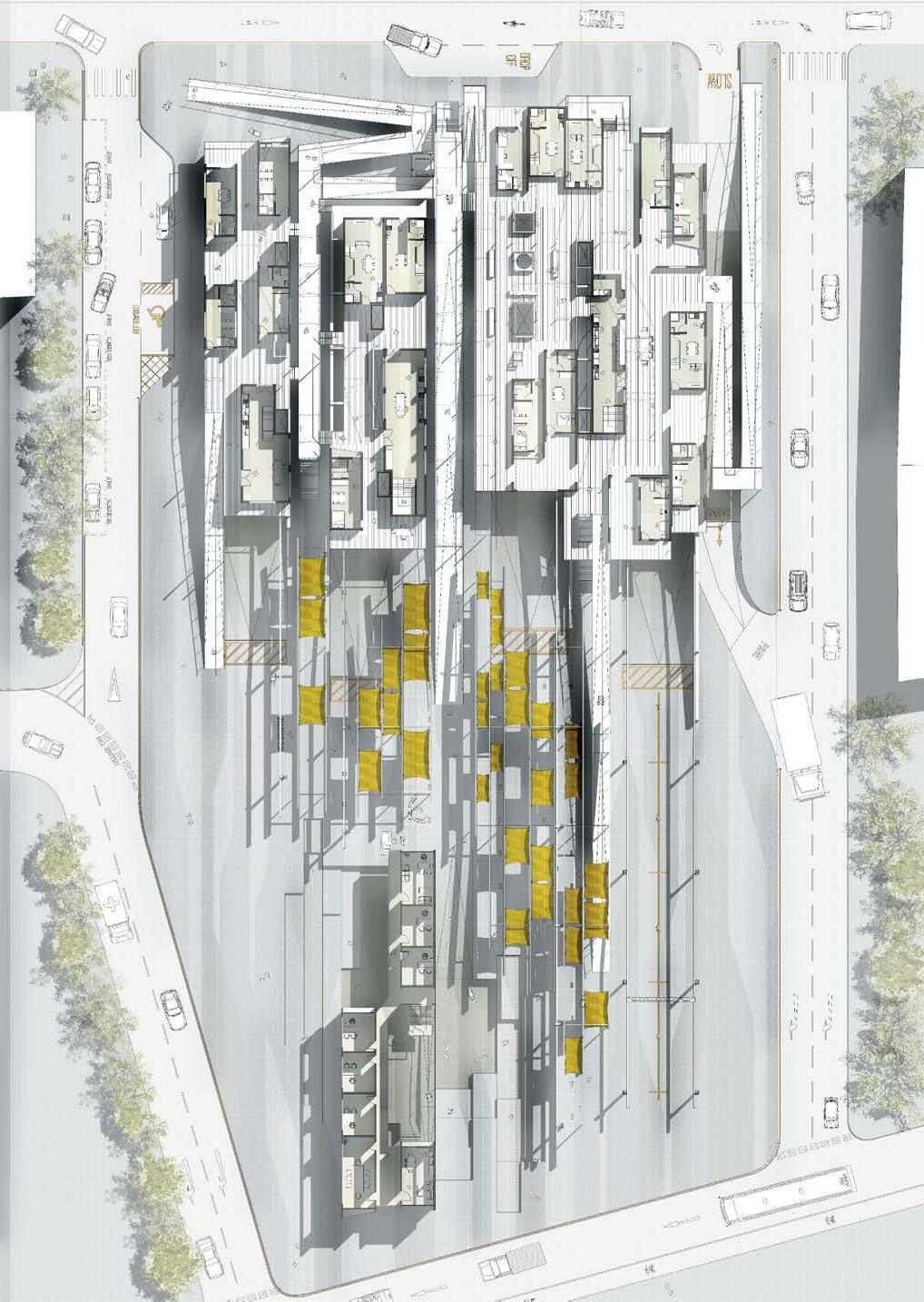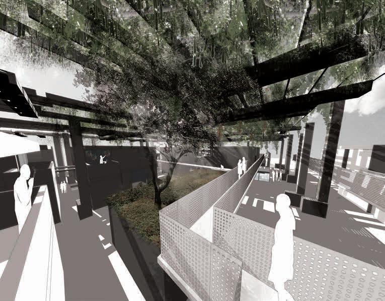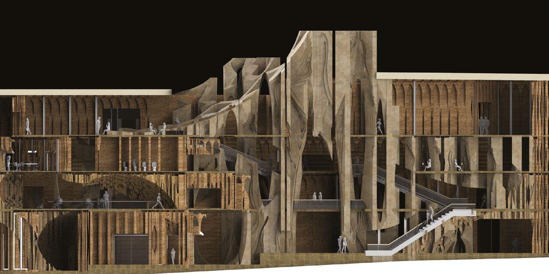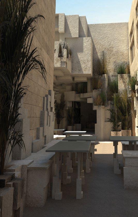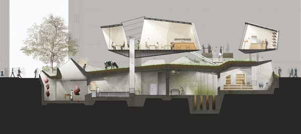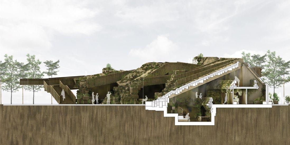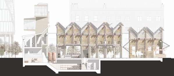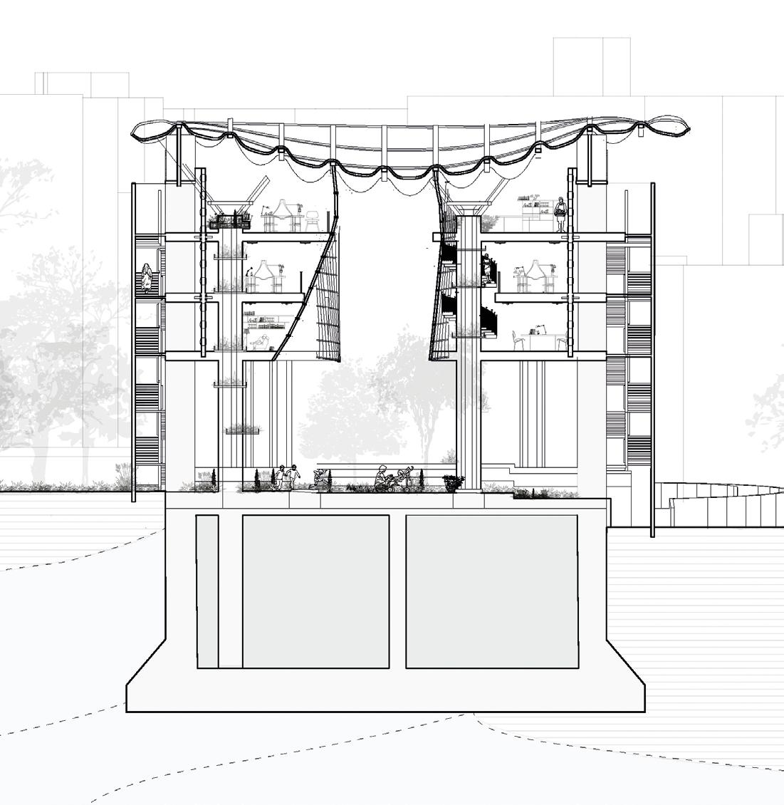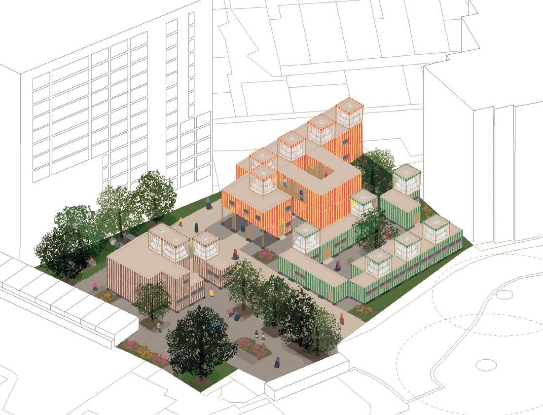 2.16–2.18 Magdalena Gauden, Y3 ‘Baking Bonds Between Us’. This community-based project fills a void in interaction spaces by placing a bakery at its core. Through bakery workshops showcasing diverse cultural products, it fosters bonds among residents of various backgrounds. The community is involved in both the bakery and the building transformation, contributing to ceramic cladding production. Retaining onsite trees promotes wellbeing, while the building’s design encourages human interaction, relaxation and collaborative hand craft activities for passers-by.