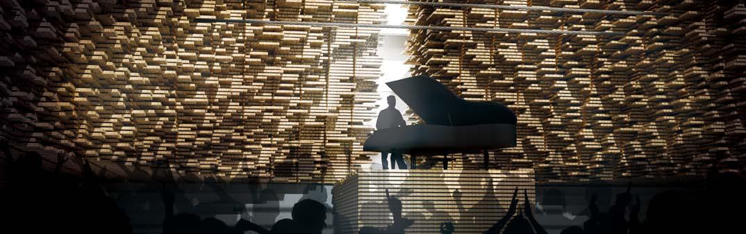 during the music festival. The timber grid-shell structure is padded with foam panelling to enhance its acoustic performace and also protect the nearby residential community from excessive noise levels.