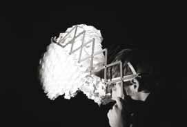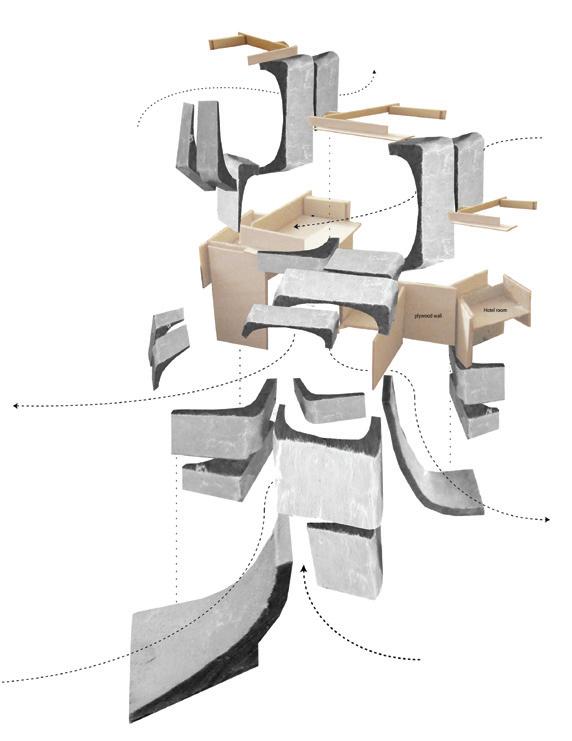 Qiuling Guan, Y3, Physical model. During the day the pavilion is used by the local skateboarding community. At night the skating ramps are transformed into seating and dancing stages. Fig. 2.9 Shou-Hang (Tim) Wu, Y3, Isolation Space, Physical models and Longitudinal Section. The individual pods are sound insulated and provide different opportunities to relax