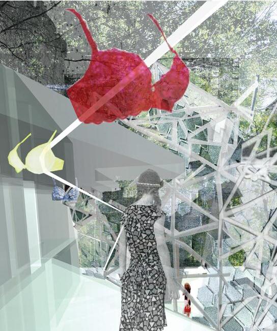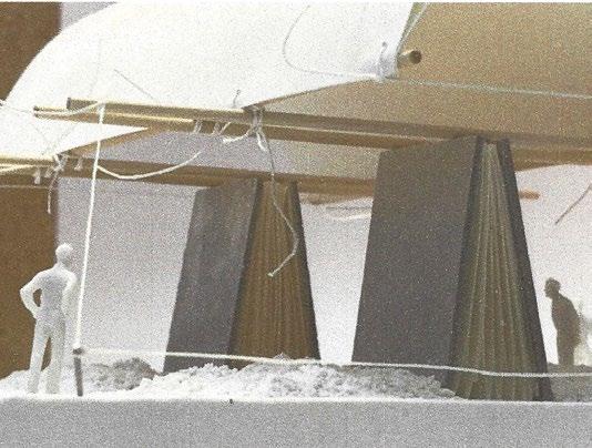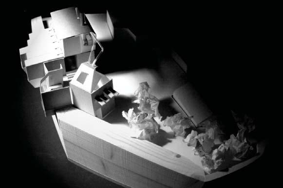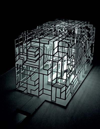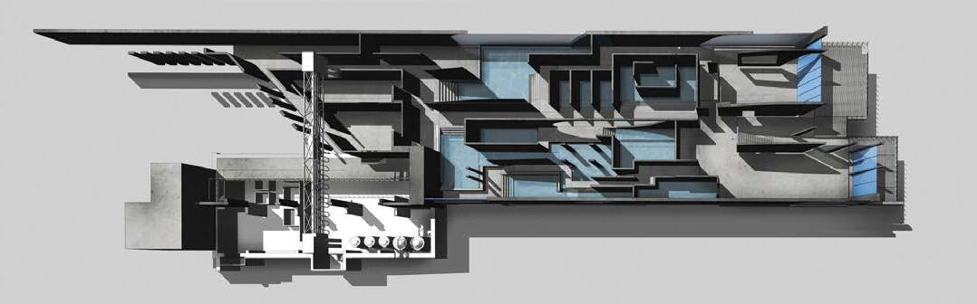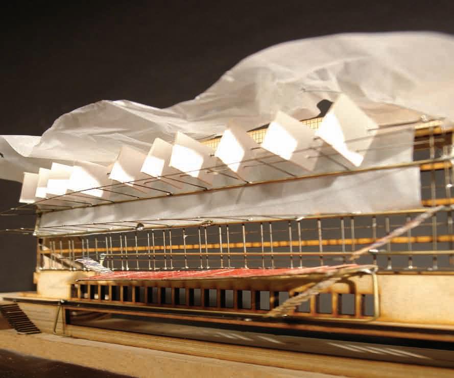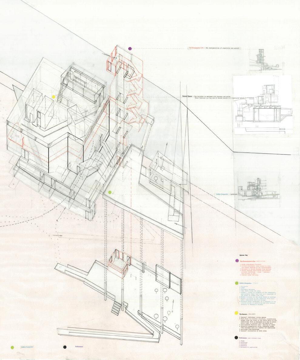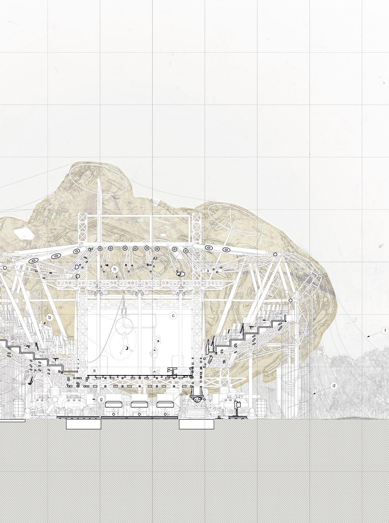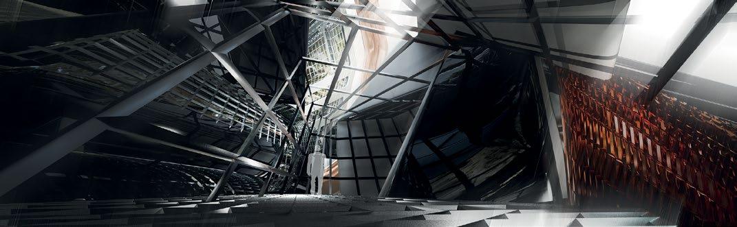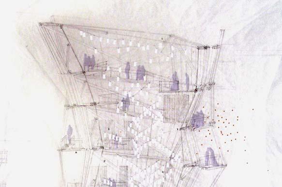 and lead natural light into the deep underground. Fig 2.8 Alexia Souvaliotis, Axonometric view, Bike workshop in Brick Lane, London. Alexia´s building addresses the east London bike community and provides a workshop for bikes and small living unit for the owner of the shop. The building represents a large shelf structure with a construction system inspired by bikes manufacturing techniques. Fig 2.9 Tao Wei, Extract of main building proposal showing theatre and kinetic facade envelope. Fig 2.10 Nawan Yudhanahas, Headquarter for the International Danube River Commission, DRC in Budapest. An over sailing roof structure provides shelter for a water-landscape which reacts to the changing level of the river. The building provides an auditorium, debating chamber, offices and laboratories.