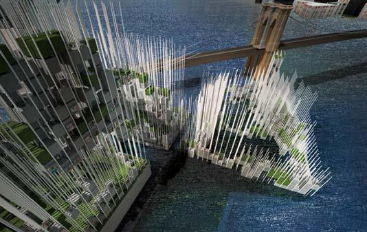 Fig. 2.10 Hei Man (Belle) Tung, Y2, New York Wetland, The building is embedded into a large marsh landscape, softening the waterfront and helping to prevent damage during storm surges. It comprises an information centre, a veterinarian clinic for birds as well as a number of hides for birdwatchers. Fig. 2.11 Rufus Edmondson, Y2, East River Yacht Club, Williamsburg. This building is suspended over the water and provides wine bars, restaurants and small aquaculture farming facility where the once famous New York Blue-point oysters were produced. Fig. 2.12 Shou-Hang (Tim) Wu, Y2, Algae research centre. The building consists of a research facility, library and auditorium. The outer façade skin is used to breed algae, provide alternative source of sustainable energy and reduce excessive solar gains.