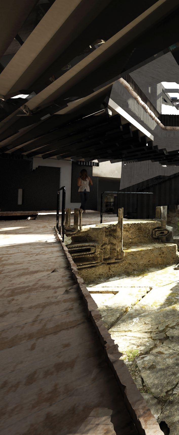 2.8 Lettie Vera-Sanso Talbot, Y3 ‘Rogue Histories’. In London’s East End, where historical erasure is a pressing issue, this project proposes a civic space called the Centre of the Unconventional Historians to research and celebrate the city’s past. The project focuses on hobbyist historians who scavenge the Thames to uncover lost relics and give voice to underrepresented lives. These unconventional historians provide a more egalitarian account of London’s past that is overlooked. The project investigates how reuse methods can support a space for these historians and the public to share local histories of the Thames and surrounding areas. The architecture embodies a three-fold register of the city’s past: a repository of ‘lost’ artefacts, a platform for previously unrepresented lives and a structure built from waste material found within the Thames.