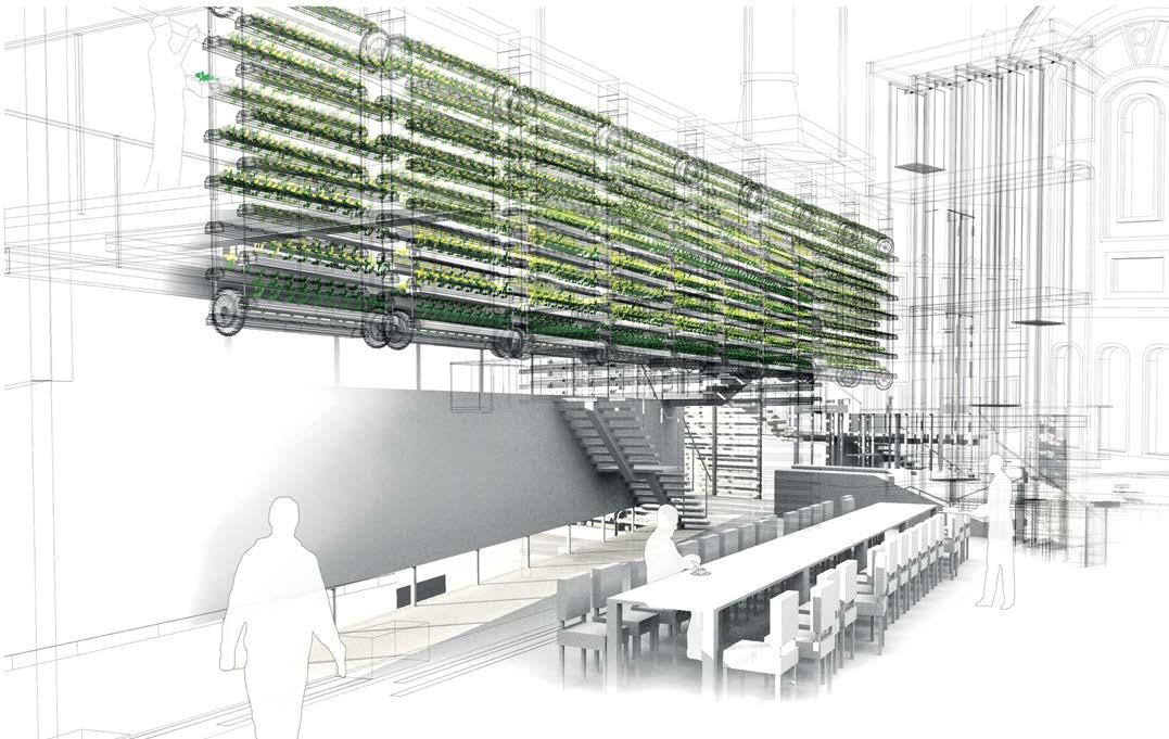 View and Ground Floor Plan. Bathhouses along the two main rivers in New York had a long tradition but vanished due to water pollution. This building uses oysters which are farmed on the roof to filter the water used for the bathing pools. Fig. 2.19 Park Hin Yeung, Y2, Brooklyn Green House and Food Market, Interior View of mushroom farming facility. The building houses a variety of greenhouses, public market and cafeteria introducing new gardening and growing technologies to the public.