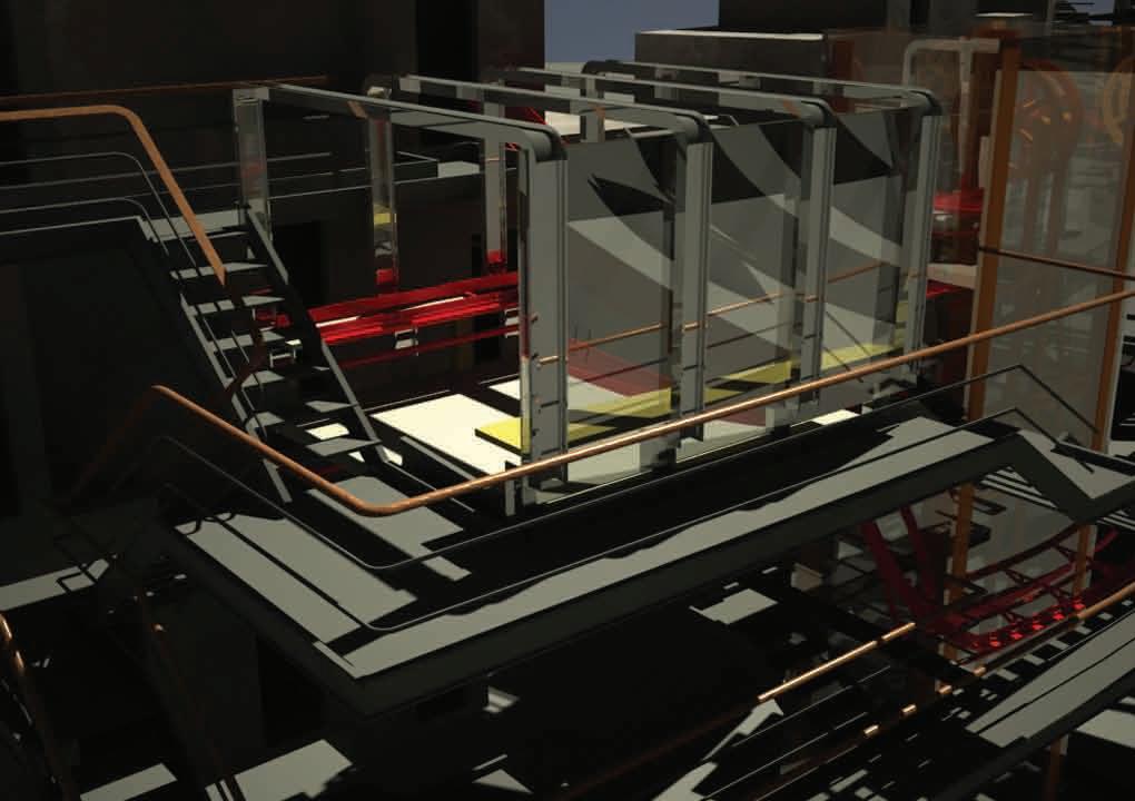 2.11–2.12 Regan Reser, Y3 ‘The Ritual’. The project is a spa for Limehouse Basin boat dwellers. It fulfils the basic human need for bathing while aiding mental and physical health through relaxation rituals. Inspired by the stages of water purification and the site’s historical accumulator tower, the spa filters wastewater supplied from the boats. This creates an off-grid water recycling system that mimics the boat dwellers’ lifestyle and alleviates the burden on London’s sewage system. The building utilises both mechanical and ecological forms of purification, with wetland roofing as the first level of filtration before the water enters mechanical processes for use in cleaned pools and steams. Black water is used to create biogas to power the spa. The project combines a study of historical infrastructure, consideration of users’ needs and innovative water recycling.