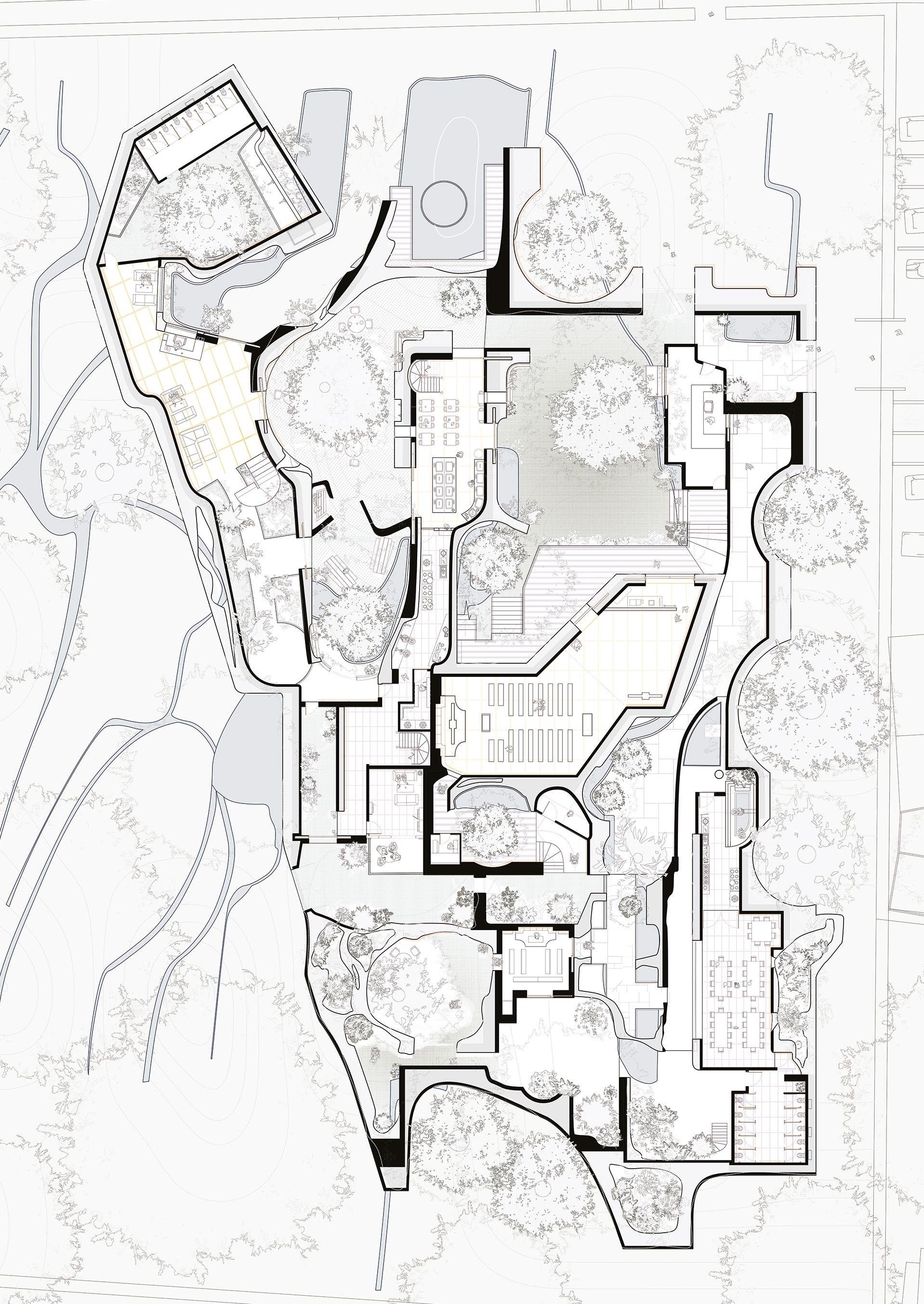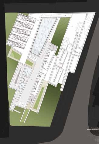 Plan, Light therapy centre in Vienna. Vienna is the home town of Siegmund Freud, the father of psychoanalysis and therapy. Light therapy is a rather new concept to treat disorders like depression. Maria’s building is embedded with various embedded fibre-optic and facade envelope devices which can be exactly tuned to create different light conditions inside the centre. Fig 2.16 Miljun Celeste Wong, Axonometric view, Dog-spa on the river Danube in Budapest. Celeste’s proposition consists of a dog spa, veterinarian clinic and dog shelter for a city which has the highest population of dogs in Europe.