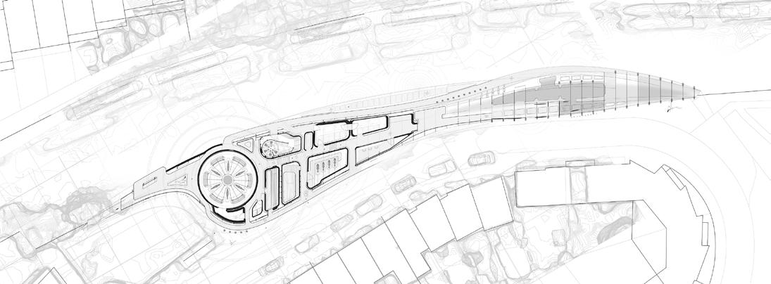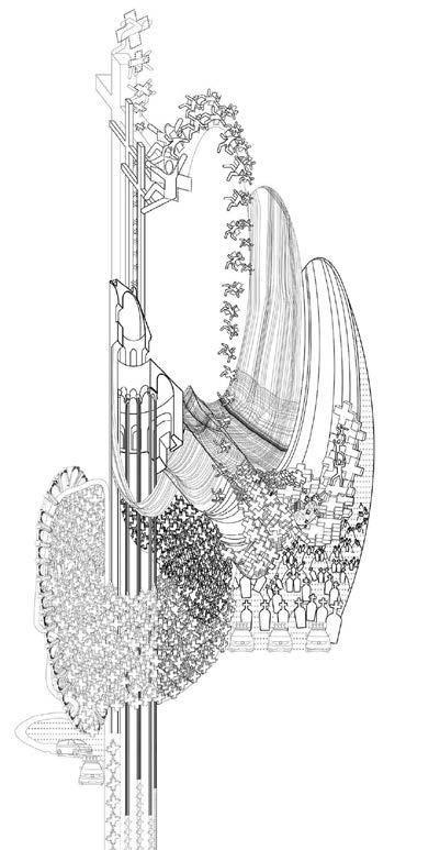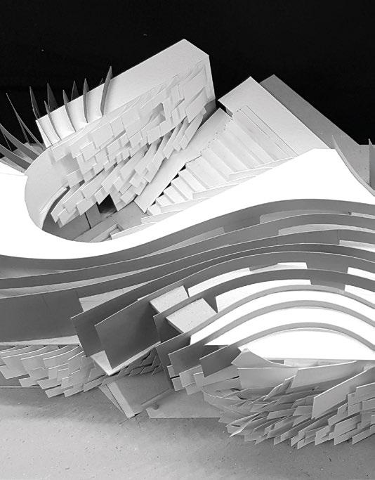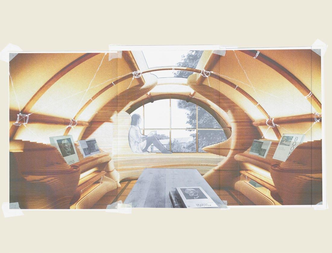 2.13, 2.16 Graeme Wong, Y2 ‘Avian Arcadia’. This proposal for E1 Waterbird Welfare, a community group in Limehouse, presents a sanctuary for injured waterbirds that serves as a symbol of renewal. Beyond rehabilitation, the building provides a space for education where volunteers and students learn about safeguarding urban wildlife. The design, echoing a bird’s wing, symbolises the journey to recovery and return to the wild. The project embodies self-build and repair, empowering individuals to actively restore their environment and foster stewardship. Together, the community works to rescue, save and rehabilitate urban wildlife, ensuring a thriving ecosystem for the future.