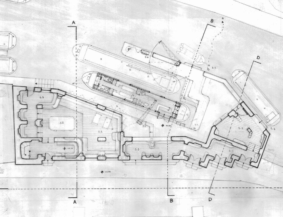 2.15 Esin Gumus, Y3 ‘Thames Interpretation Centre’. The project explores Limehouse’s vanished maritime history through its shoreline, focusing on Limehouse Hole Stairs. Inspired by the scattered rubble and remnants along the shore, a pier design incorporating an exhibition space is proposed. The pier’s accessibility changes with the tides, creating a dynamic interaction with the site’s historical narrative, allowing people to engage with and learn about Limehouse’s past. The project also includes a Thames interpretation centre, showcasing the river’s historical significance and its evolving relationship with communities. It promotes river restoration, rewilding and the use of materials dredged from the river in traditional crafts. The centre fosters skill sharing and strengthens community ties through these activities.