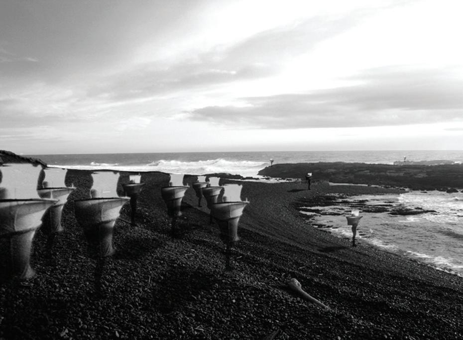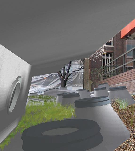 2.9–2.10 Laura Dietzold, Y3 ‘An Act of Continuous Repair’. Significant sea level rise in London is predicted under high emission scenarios, affecting infrastructure and the built environment in flood-prone zones near the Thames. Current flood defence infrastructure takes a simplistic approach, attempting to ‘design our way out’ of the challenge with walls and barriers. This project proposes a retrofitted form of flood defence infrastructure that encourages controlled flooding, allowing the city to make use of water as a precious resource. By focusing on retrofitting existing infrastructure and adapting it to future needs, the proposal creates a symbiotic relationship between the built and natural environments, rather than relying on complex and expensive infrastructure that disconnects us from water.