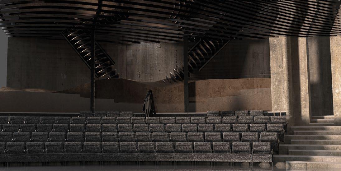 2.19 Arushi Kulshreshtha, Y3 ‘Lights, Camera, Action!’. This project revitalises a neglected community garden near Regent’s Canal into a vibrant space for local businesses and aspiring filmmakers. It explores the intersection of theatre, film and architecture, incorporating stories and studio systems into the design. Located in Tower Hamlets’ Vyner Street, the building offers filming spaces, workshops, meeting rooms and flexible areas. It addresses sustainability by repurposing film waste into building materials, reducing carbon emissions and promoting a circular, self-build film studio and set construction workshop.