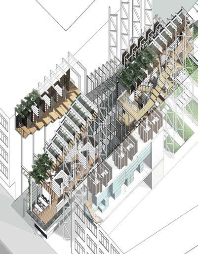 2.1, 2.14, 2.18 Harshal Gulabchandre, Y3 ‘The Kitchen Estate‘. Commercial Road High Street in East London has a range of socioeconomic and ecological disparities which require urban repair. The diasporic Bangladeshi community residing on this high street face a multitude of intersectional housing and food insecurities. The project addresses these systemic issues through a community kitchen, vertical farm and social housing. Using selfbuilt rammed earth construction as a vehicle for sociotechnical community engagement and material localism on the high street, the building repairs local disparities and empowers local people.