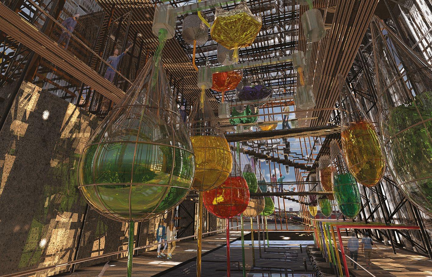 Qidan Chen, Y3, Ferry Terminal, Physical model. The building is part of a wider system of artificial landscapes used to purify large quantities of water, currently flowing unfiltered into the East River. Fig. 2.16 Ka Yu (Jamie) Wong, Y3, Capsule structure, Aerial View. The building provides structure and services for small residential capsules. The individualised pods vary in size and can be easily transported to other locations around the world. Fig. 2.17 – 2.18 Tung Ning (Vincent) Yeung, Y3, Brooklyn Navy Yard Bathhouse and Oyster Farm, Interior