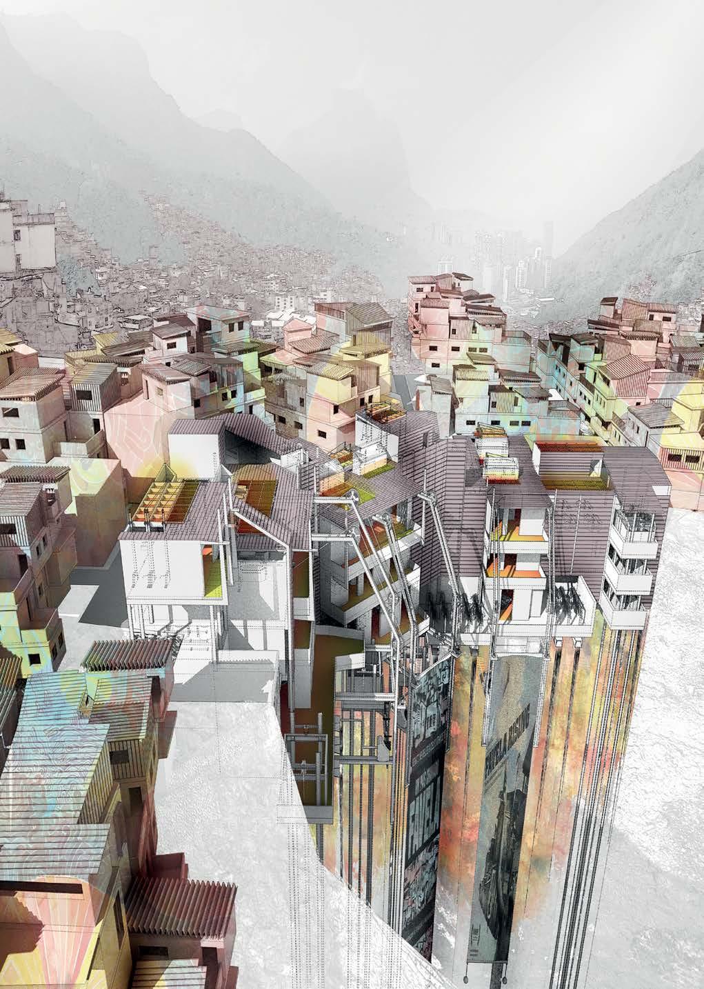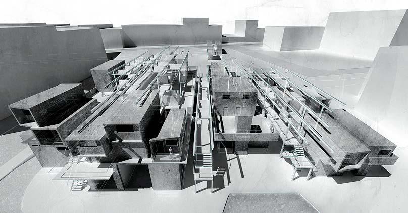 Fig 2.13 Stanley Tan, Internal perspective, Communal housing, Tottenham Hale, London. Fig 2.14 Lauren Marshall, Aerial view, Budapest, the “World Capital of Spas”, is located over a geological fault line which is the reason for the thermal activity in the ground. Lauren carried out a series of iterative landscape interventions on the slopes of Buda proposing an outdoor bathhouse with wide-ranging views of the city. Fig 2.15 Maria Goustas,