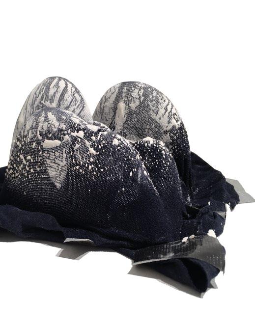 5.22–5.24 Hiu Ching (Alex) Yam, Y3 ‘A Ritual for Catharsis’. Inspired by a Mayan stone tablet depicting a royal bloodletting ritual between King Shield Jaguar and Lady Xook, the project re-enacts Mayan and modern pain rituals to understand the relationship between pain, hallucinations and elation. Using fabric, paints, embroidery and beading, the act of piercing is recorded through drip patterns. The final artefact recreates and renews traditional pain rituals through tactile and interactive means, subverting traditions into therapeutic methods. The project draws on Mayan bloodletting rituals from over a thousand years ago, applying them to modernday issues.