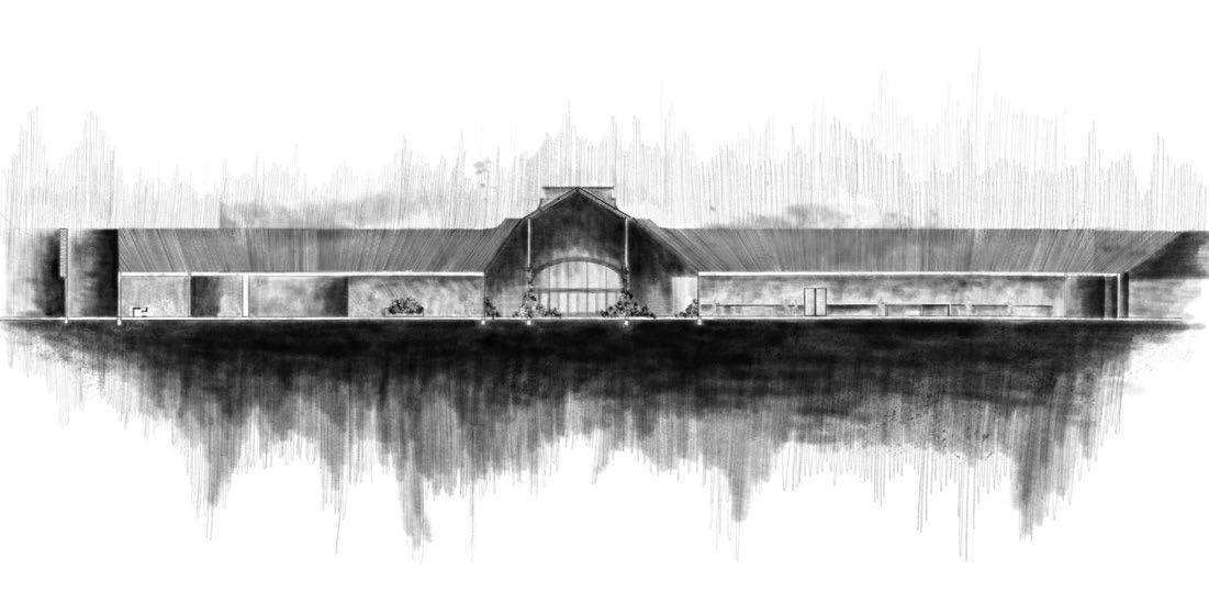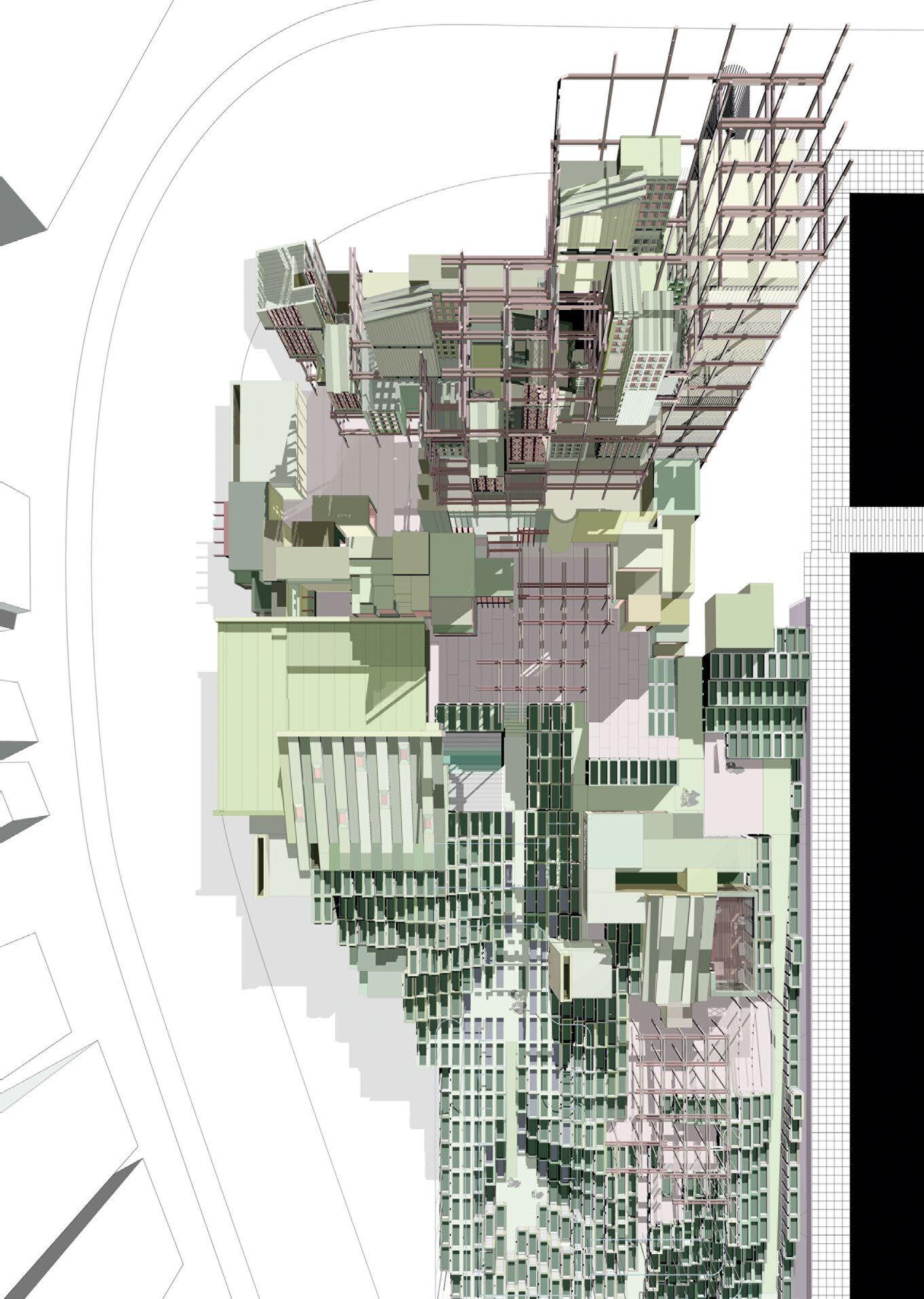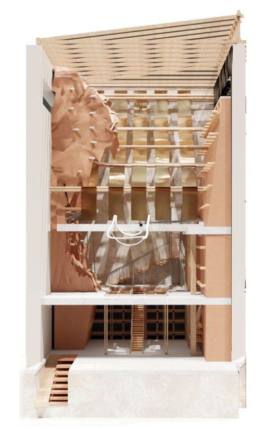 5.6–5.8 Tsz Yung (Vivianne) Wong, Y3 ‘The Wounded Priory Meadow’. This project, based in Hastings and centred on the Priory Meadow Shopping Centre, addresses the adverse effects of gentrification on living standards and mental health. It offers a comprehensive solution, starting with on-site greenhouses cultivating calming plants and herbs. These botanicals are processed into soothing shampoos and conditioners, used in an on-site salon and café. The architectural elements enhance its therapeutic goals, with hair ropes casting dynamic shadows for an immersive experience. At the heart of the shopping centre, a garden provides a tranquil retreat where visitors can reconnect with nature. The project highlights mental health through the integration of architecture and nature, fostering a healthier, more connected community in Hastings.