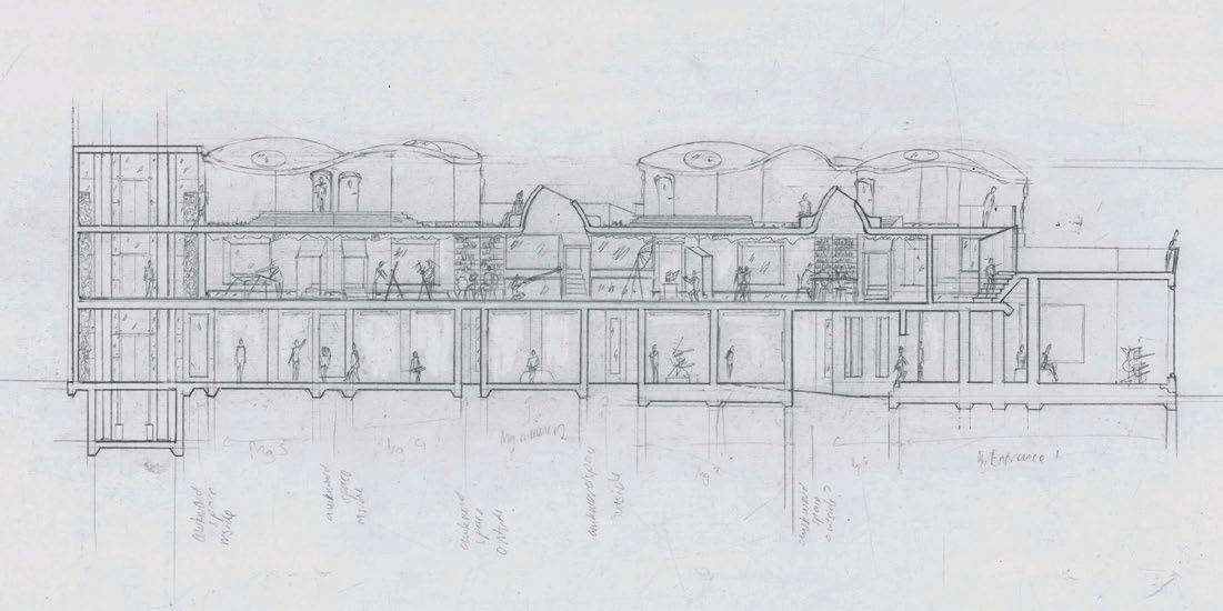 5.17–5.18 Akif Rahman, Y3 ‘Return to Babel’. This multilateral mission caters to a group of international artists interested in collaboration and teaching through art practice. The building contains a gallery, residence, library and workspace, private studios and a communal studio. The programme is inspired by the Rosetta Stone and builds on themes of cultural and information exchange through multiple senses and pedagogies. The final design becomes a multi-layered means of transmission.