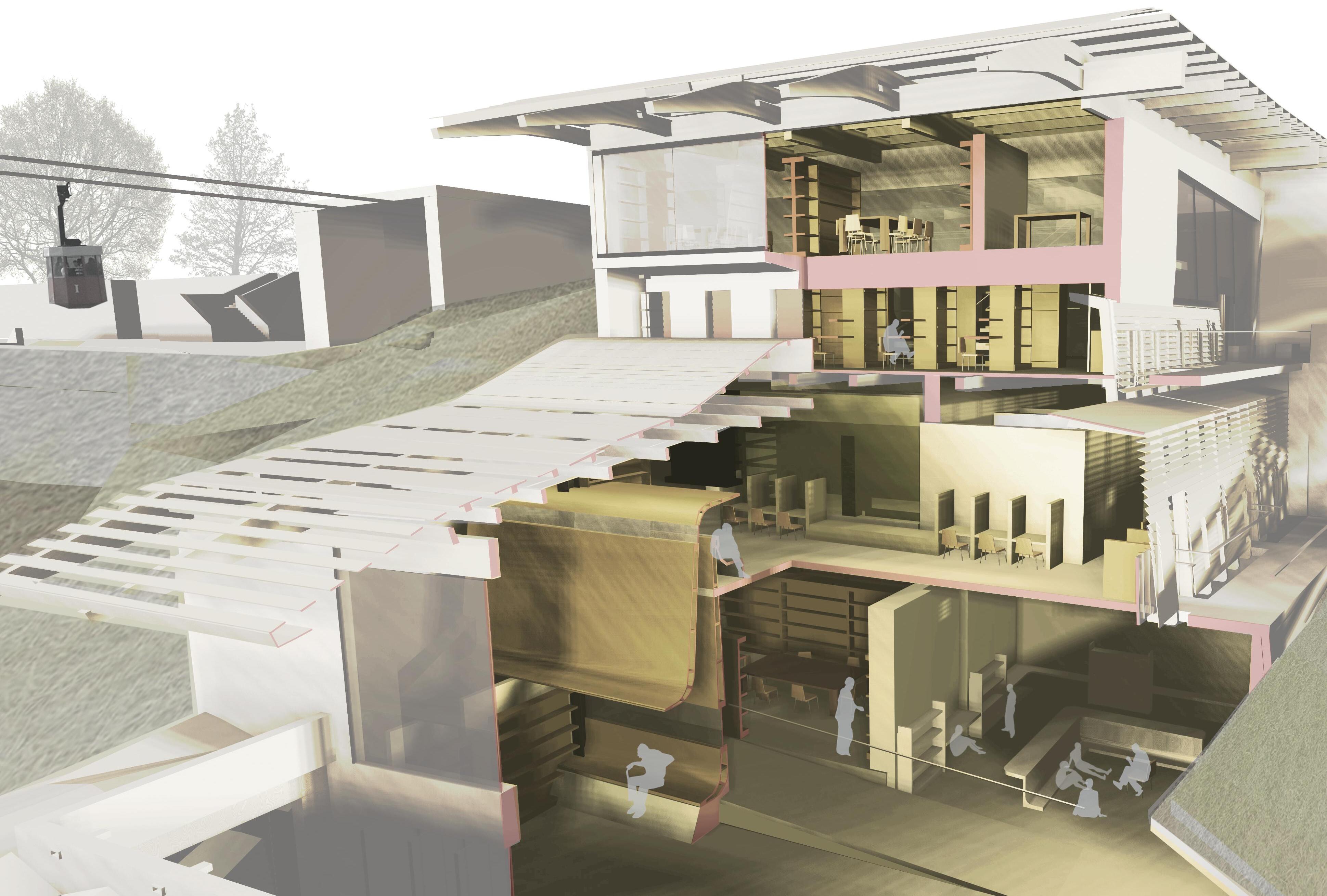 centre that educates Athenians on water conservation and filters water from the Eridanos River beneath Mount Lycabettus. During drought, the facility holds water for rationing and treatment. In times of need, Athenians can ascend the mountain for shelter and water. The project uses interpretive pieces to communicate this threat, incorporating the Epic of Gilgamesh to represent the looming presence of disaster.