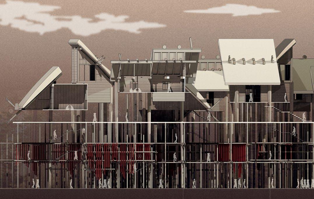 Fig. 5.13 Simran Sidhu, Timber housing village. The project investigates traditional Ottoman timber structures close to Fener and Balat, the historic home of a large Greek and Jewish population where houses are about to be eliminated in a big governmental sweep-out. Fig 5.14 Huizhen Ng, The smoke walls walk through. Blurring the boundaries between indoor and outdoor spaces, the proposed building creates spaces in which smokers are able to smoke shisha within the comforts of interiors spaces, while complying with the Turkish Tobacco Law.