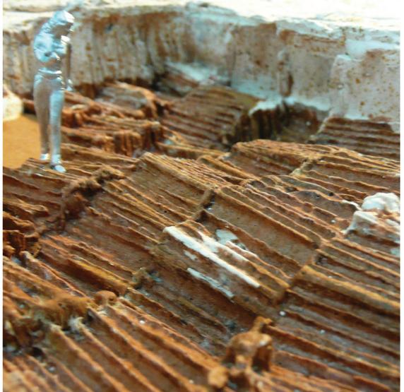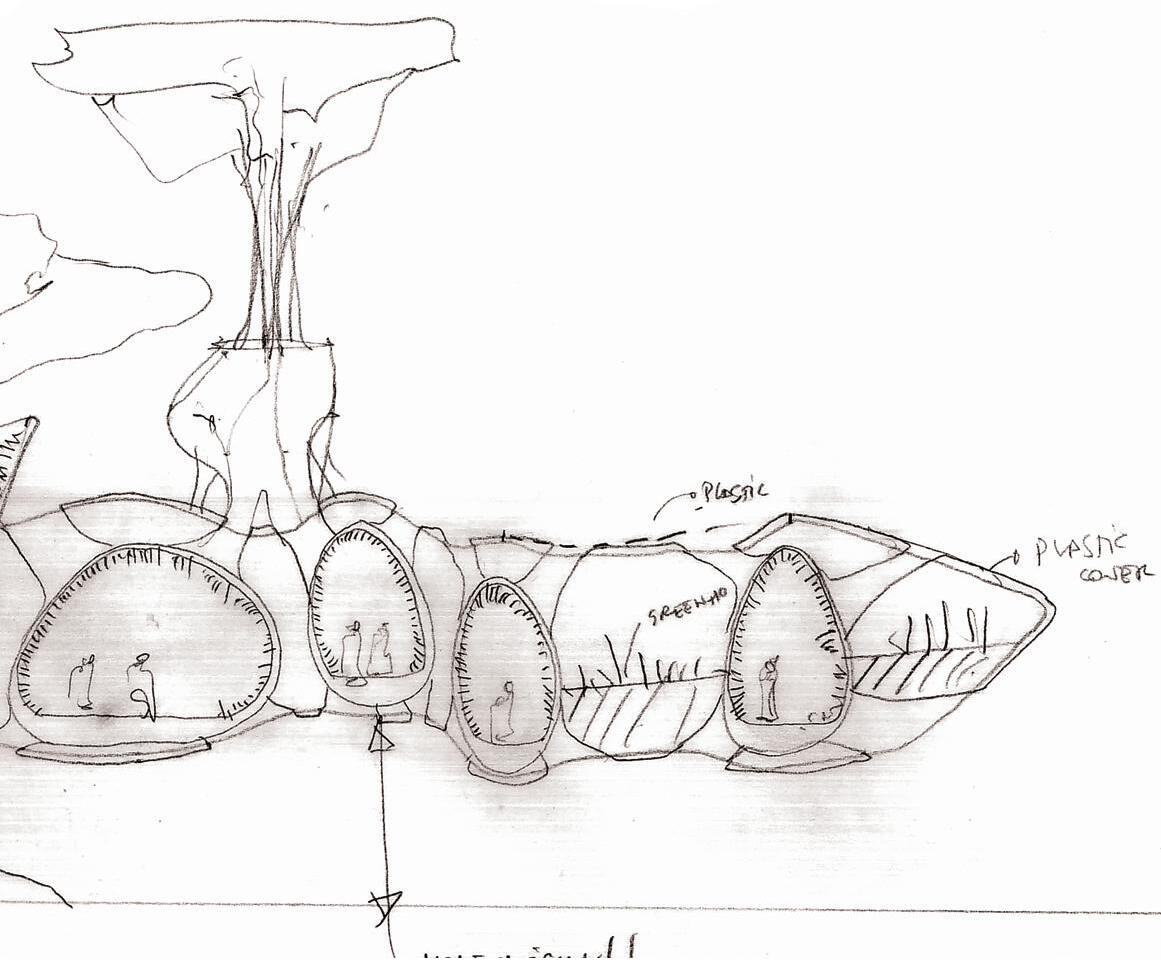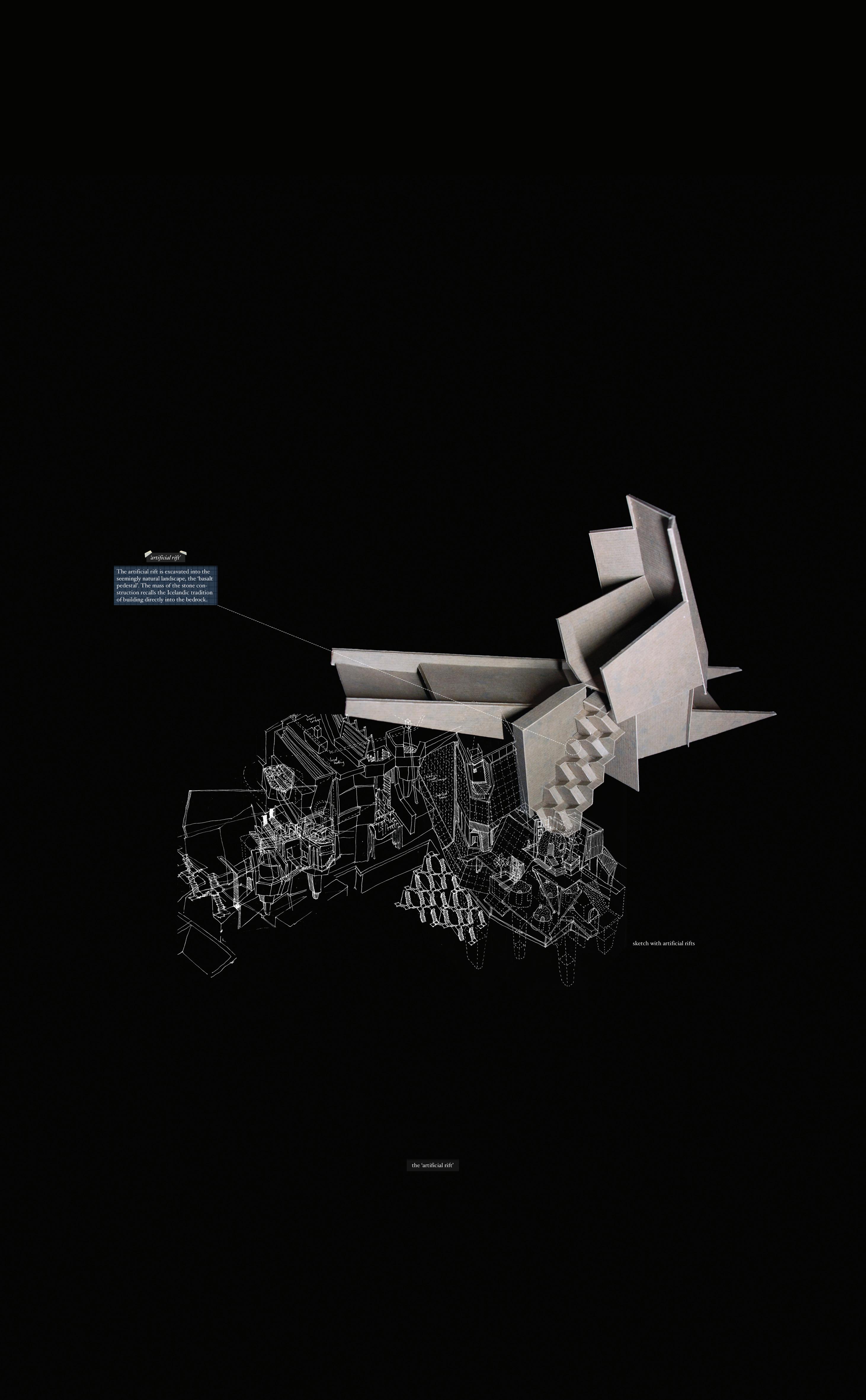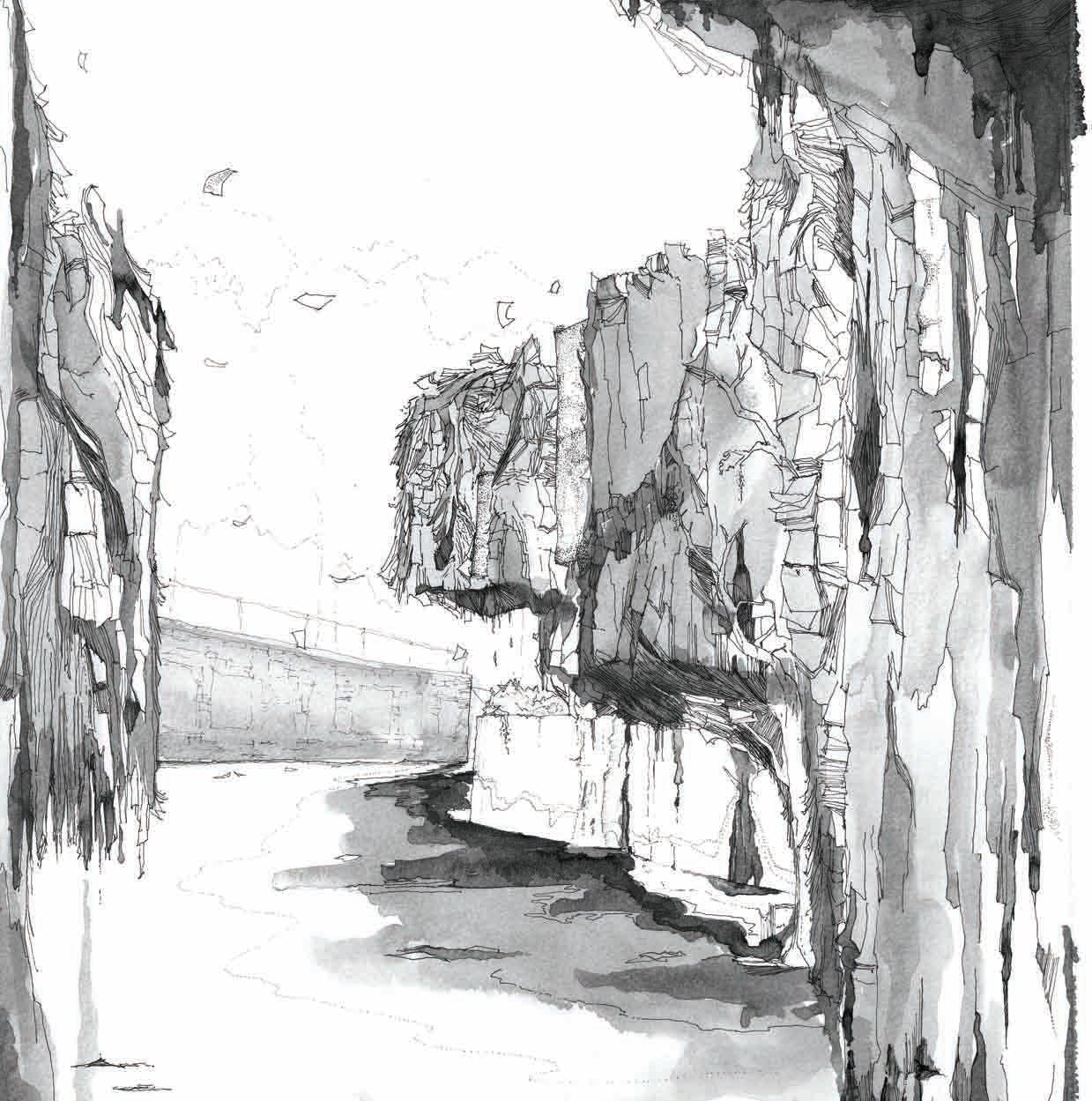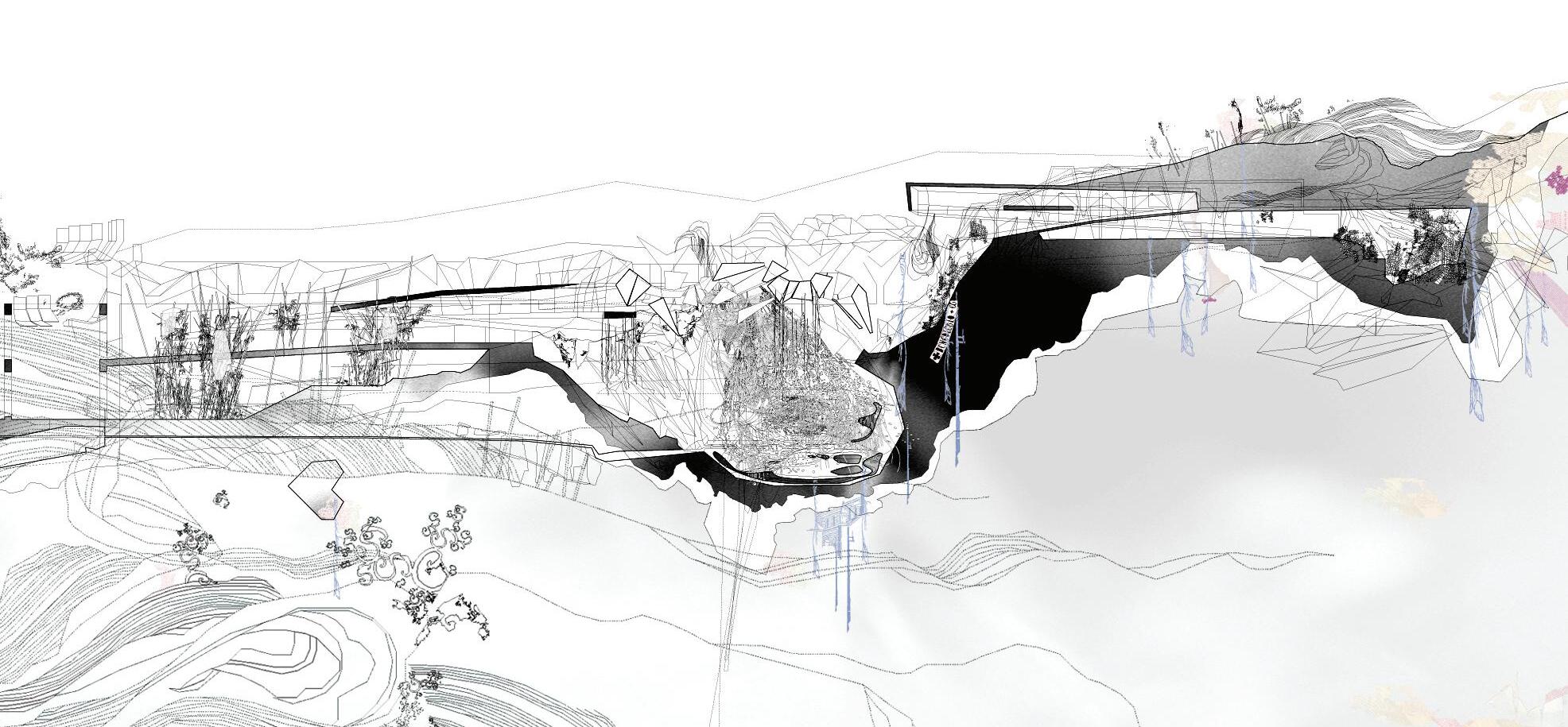 11.1 Henry Aldridge, Y5 ‘The Chalk Institute: Growing a Stone Architecture’. Chalk extraction for concrete production has resulted in chalk pits with unrealised ecological potential. This project uses waste concrete to precipitate stone – much like stalactites – to produce an architecture of growth in quarries, both in stone and flora. The proposed Institute, which researches chalk ecologies and slowly grows in size, is made of chalk and concrete runoff, and becomes a history of the site, reflecting both its history in extraction and its future growth.