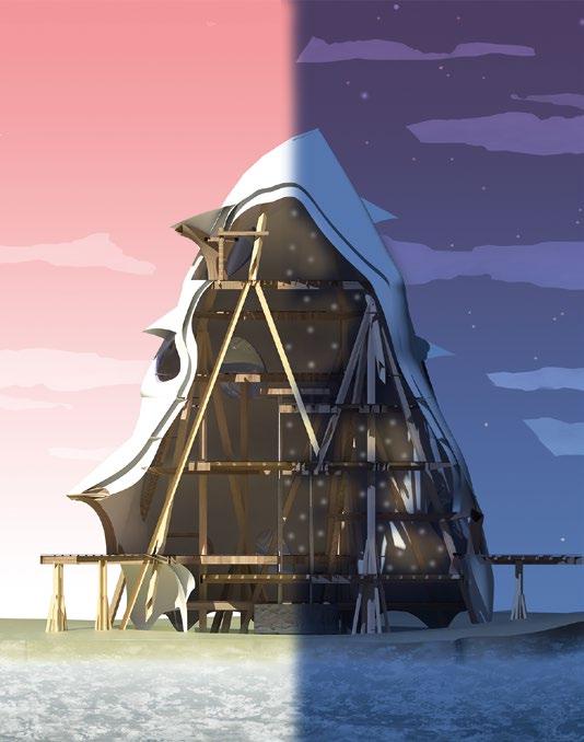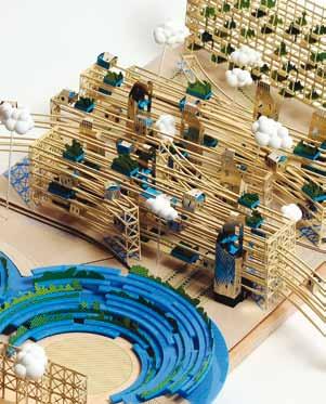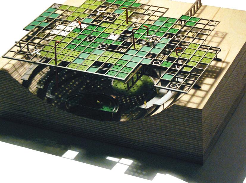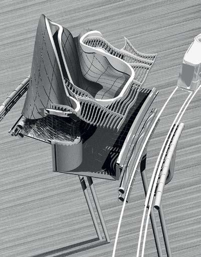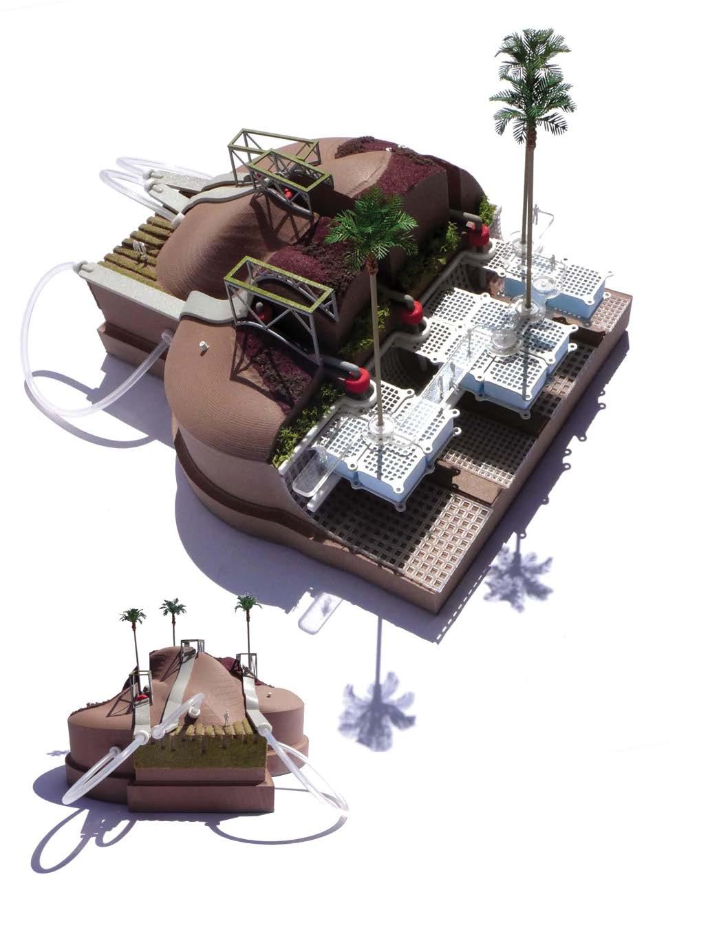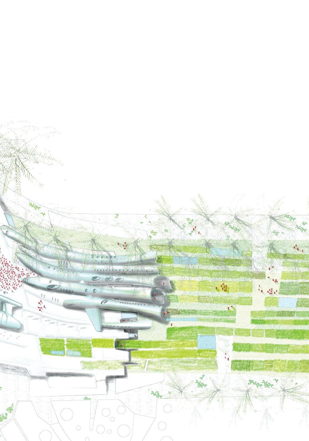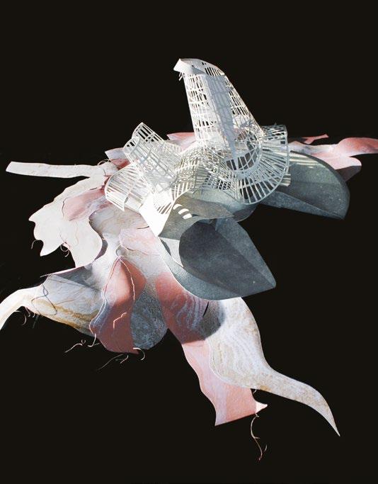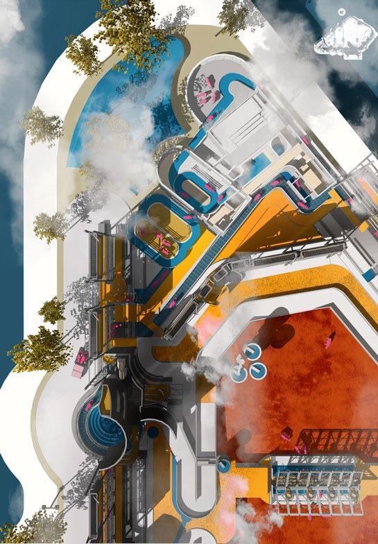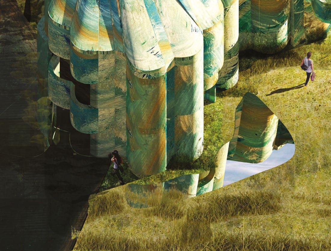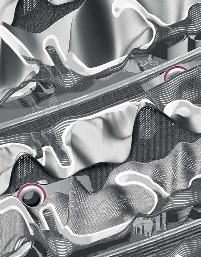 the altered, unstable ground conditions left behind by the mining system. Fig. 11.7 Danny Lane, Y4, South Beach Bakery, Miami. The damp cardboard jacket behaves as an inhabitable building fabric which generates the climatic conditions demanded by the processes of the bakery. This project celebrates Florida’s love of air-conditioning but challenges the routine method of how it is achieved. Fig. 11.8 Mara-Sophia Kanthak, Y4, The Everglades Replenishment Project. A water refilling station for Recreational Vehicles on one of the tree islands in the subtropical wetlands. The water purification process is exhibited on an elevated coaster structure, combining Floridian fun park culture with a contribution to the endangered Everglades ecosystem.