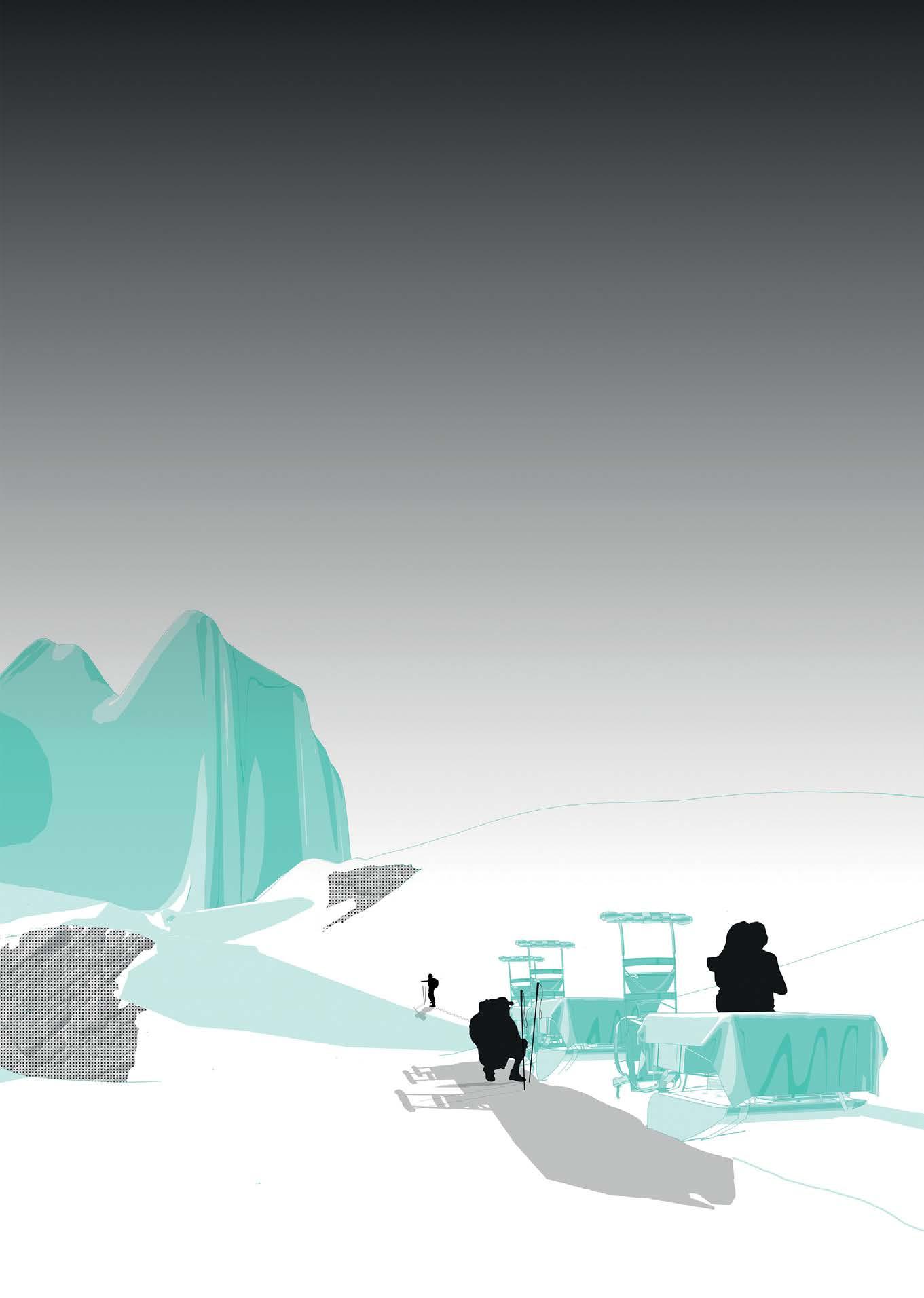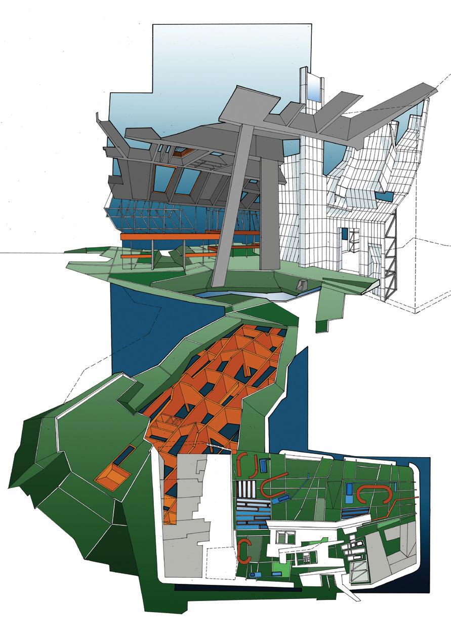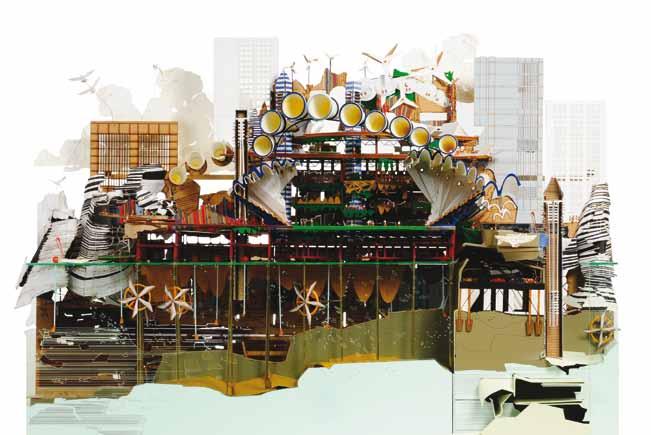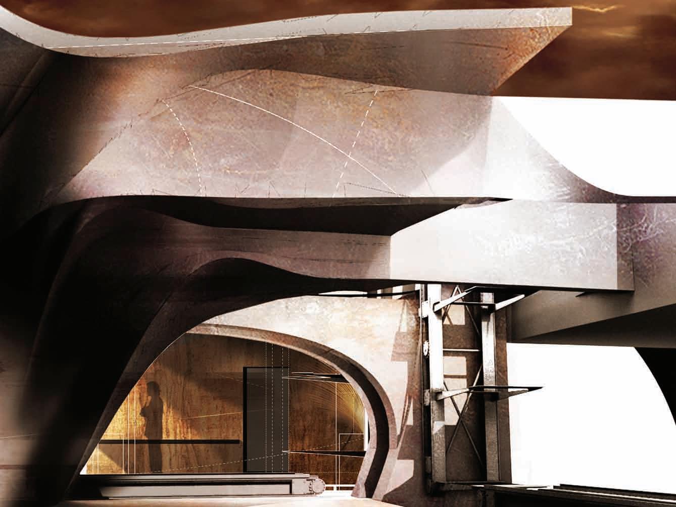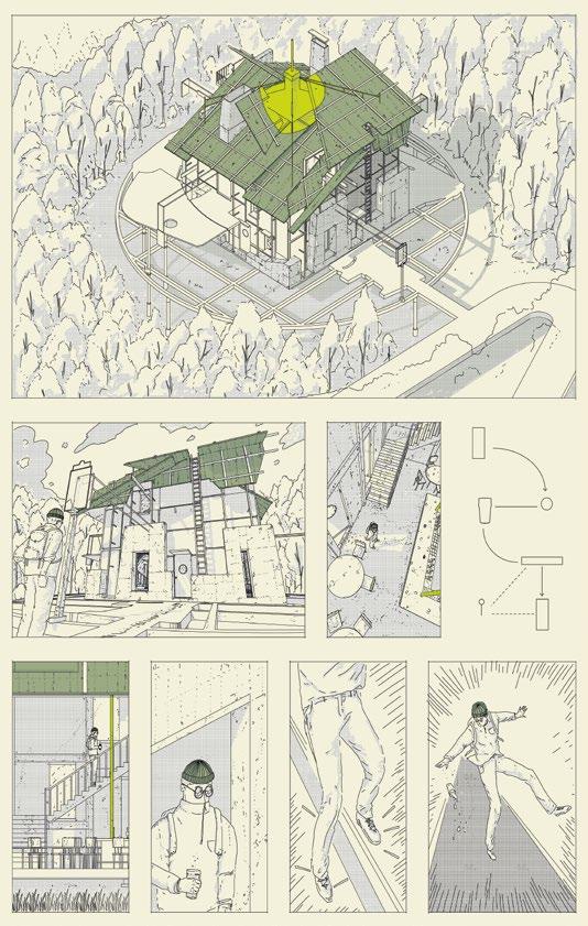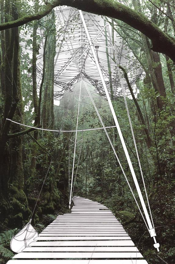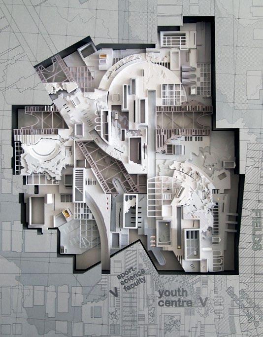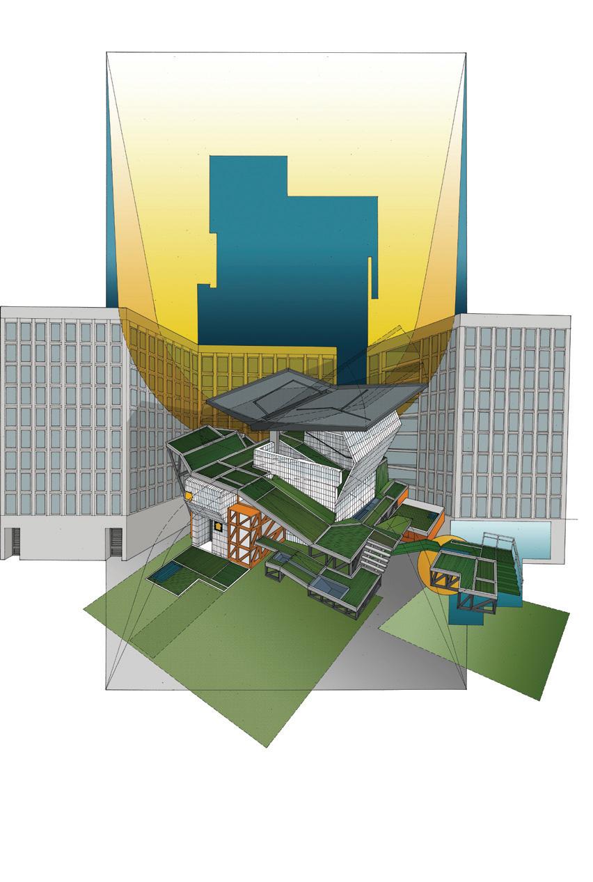 the altered, unstable ground conditions left behind by the mining system. Fig. 11.7 Danny Lane, Y4, South Beach Bakery, Miami. The damp cardboard jacket behaves as an inhabitable building fabric which generates the climatic conditions demanded by the processes of the bakery. This project celebrates Florida’s love of air-conditioning but challenges the routine method of how it is achieved. Fig. 11.8 Mara-Sophia Kanthak, Y4, The Everglades Replenishment Project. A water refilling station for Recreational Vehicles on one of the tree islands in the subtropical wetlands. The water purification process is exhibited on an elevated coaster structure, combining Floridian fun park culture with a contribution to the endangered Everglades ecosystem.