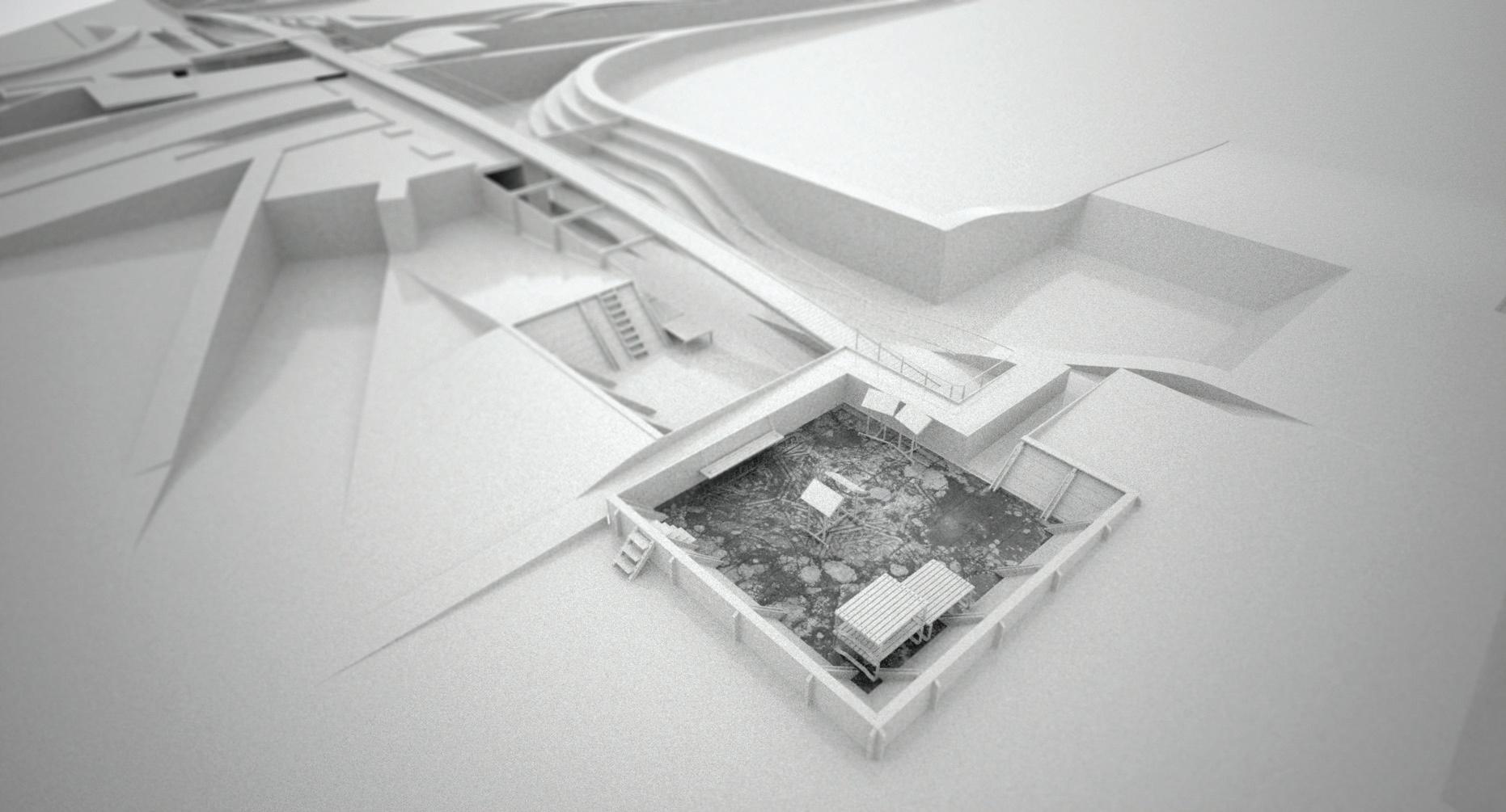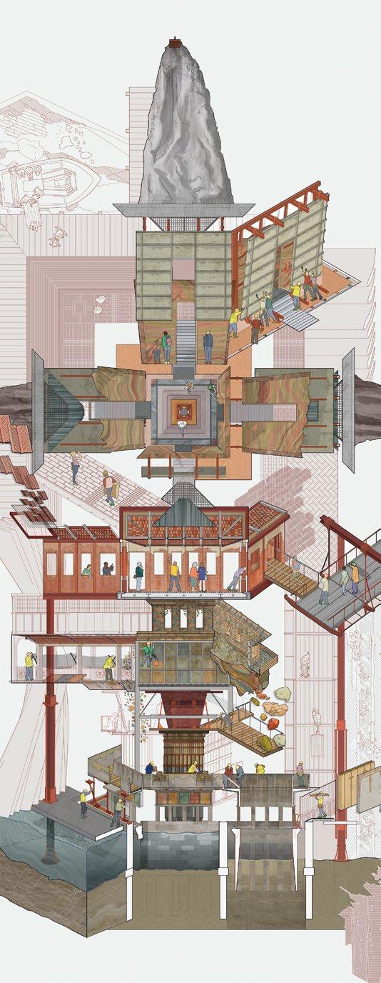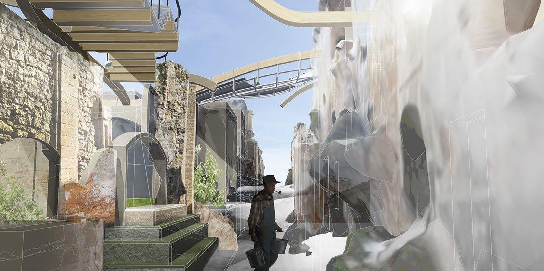 4 William Hodges, Y5 ‘Licence for a (Likely) Lithopolis’. In the peripheries of Rome’s hinterlands lies a rich material environment of Italy’s travertine quarries; this project reimagines extractive legacies as material stewardship, terraforming abandoned sites into new-found urban archipelagos.