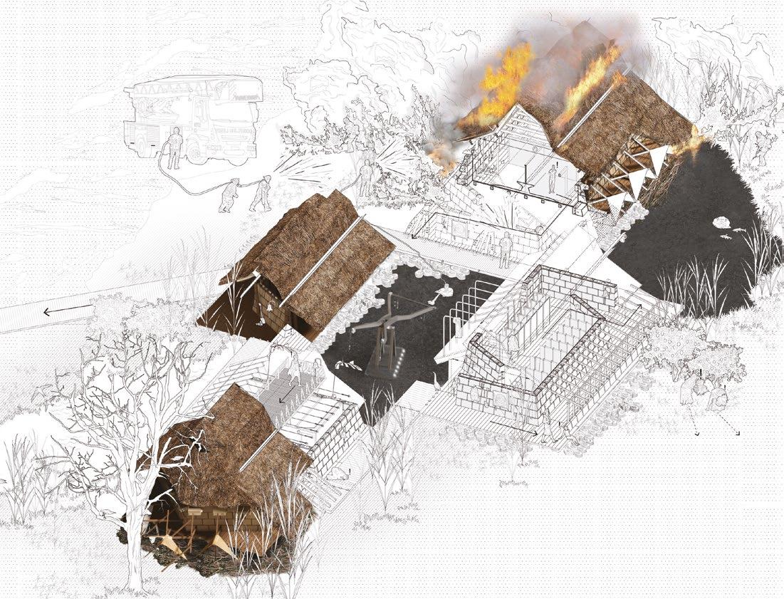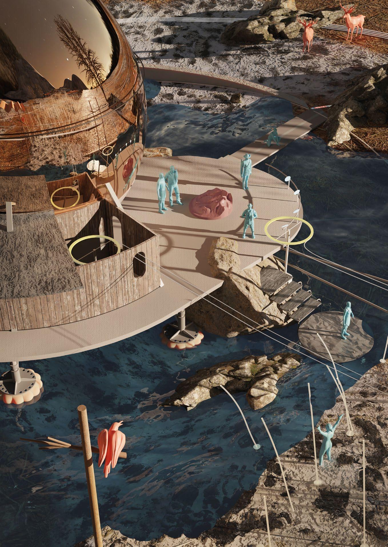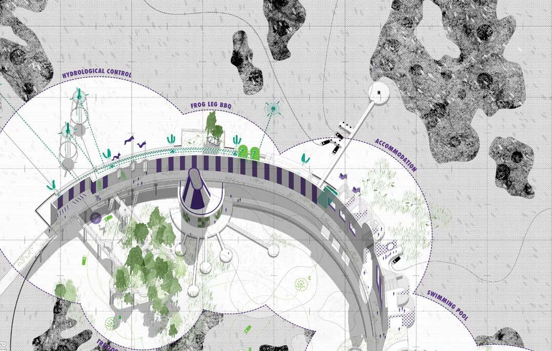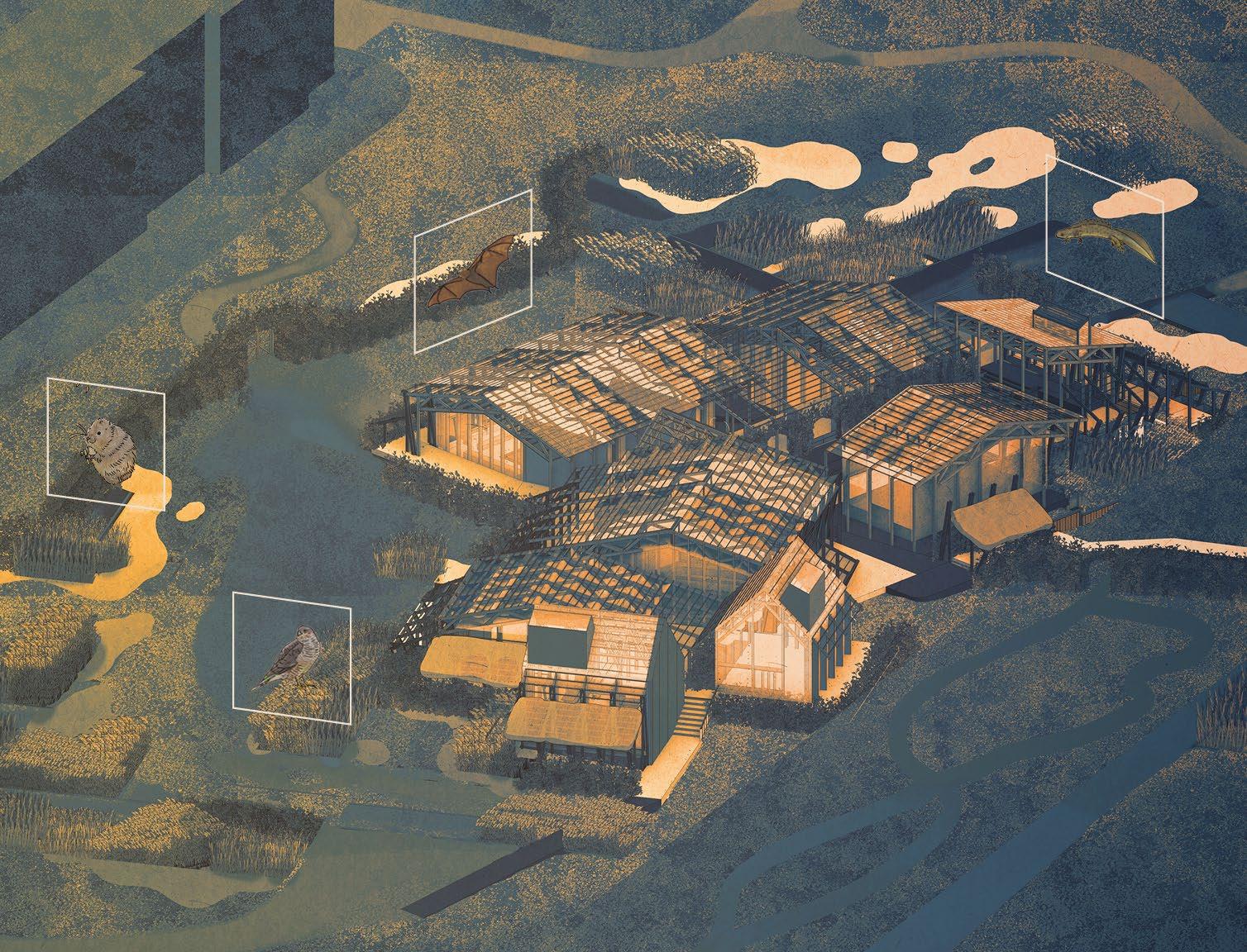 11.14 Xintong Chen, Y4 ‘Breached! A Meanwhile Marsh School’. This project provides an immediate solution to the lack of social infrastructure. It reconnects Beam Park in Dagenham back to its peatland origins through interventions that gradually decay and breach the surrounding landscape. The building remains atop a reclaimed permanent marsh landscape that accepts and adapts to an inevitable future of flooding.