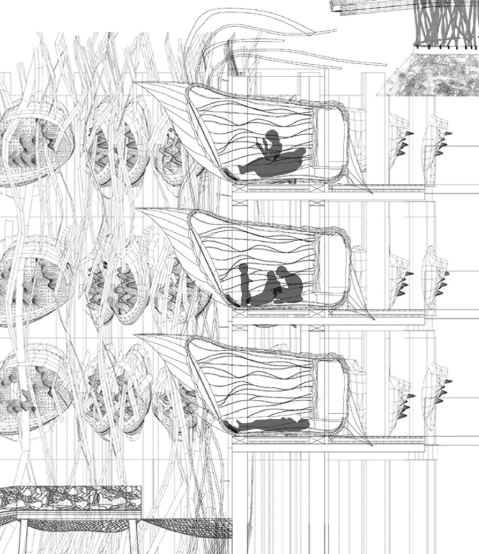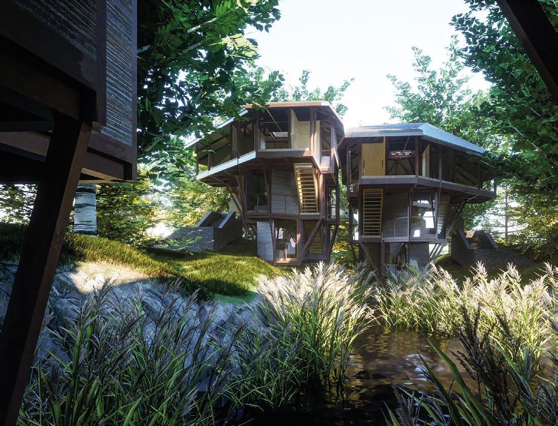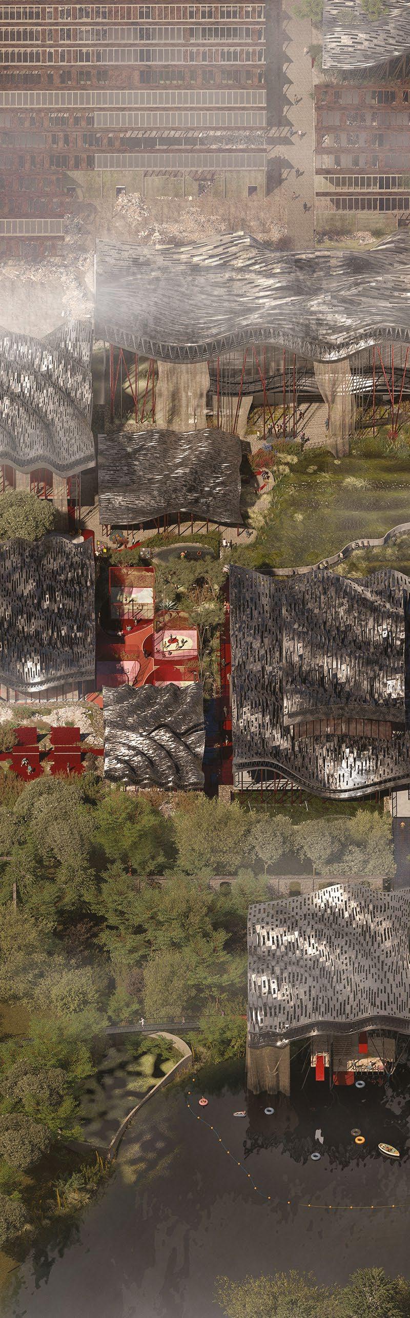 11.14 Xintong Chen, Y4 ‘Breached! A Meanwhile Marsh School’. This project provides an immediate solution to the lack of social infrastructure. It reconnects Beam Park in Dagenham back to its peatland origins through interventions that gradually decay and breach the surrounding landscape. The building remains atop a reclaimed permanent marsh landscape that accepts and adapts to an inevitable future of flooding.