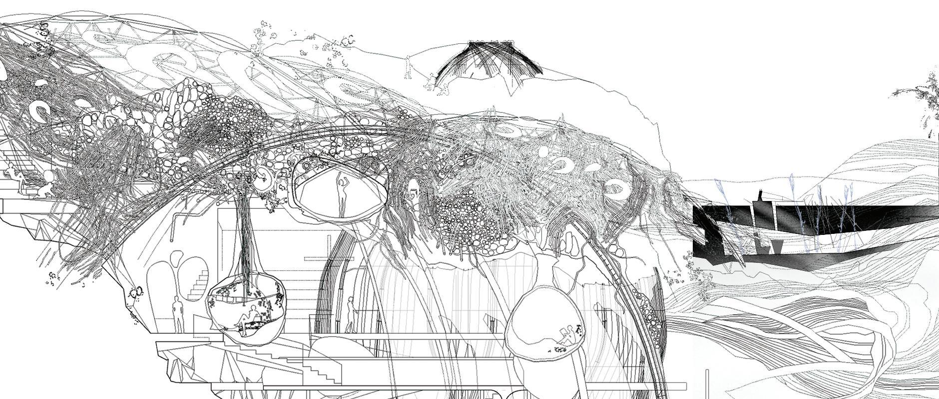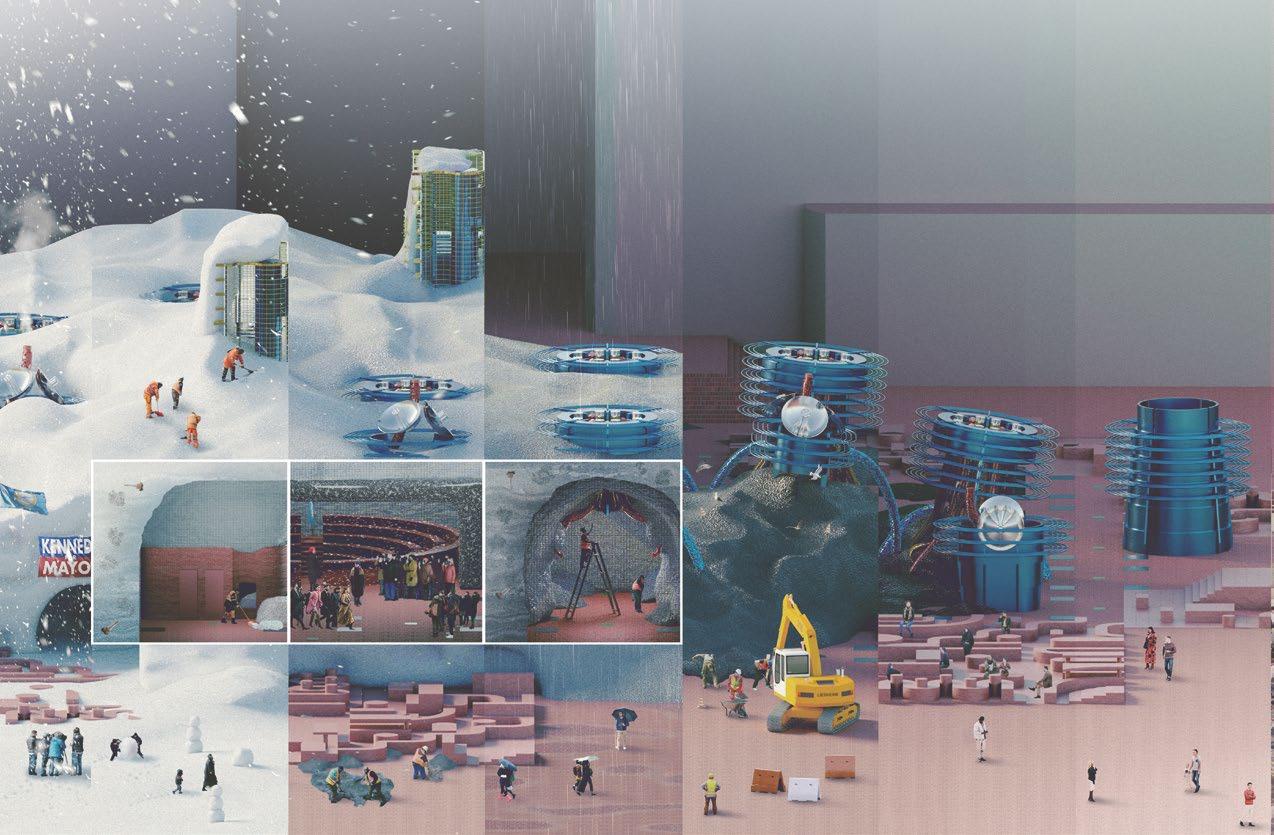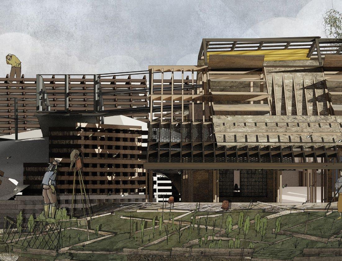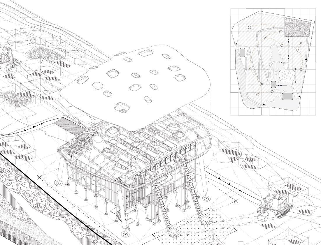 11.12 Jane Li, Y4 ‘The Wasteland Reclamation Facility’. Perched atop the toxic spoil heap of Beckton Alps, the facility explores the integration of ecological rehabilitation and educational functions via the process of myco-remediation. Utilising locally sourced materials, including remnants of former ski infrastructure, the project highlights the transformative potential of brownfield sites and a future where industrial relics become foundational elements for resilient landscapes.