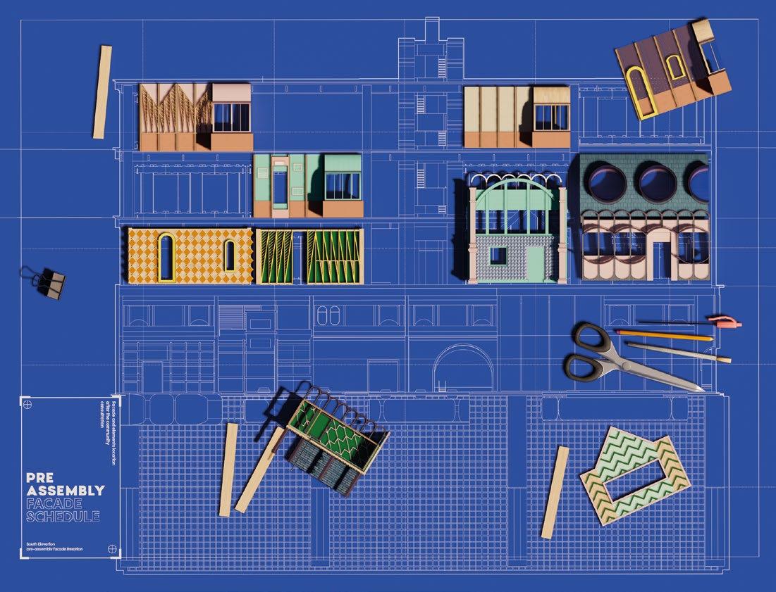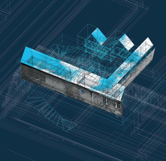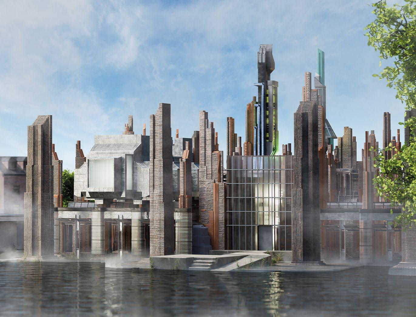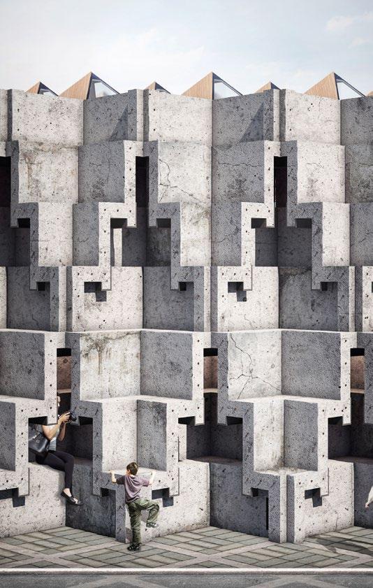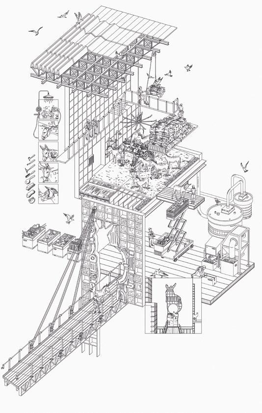 11.7 Ian Wille, Y4 ‘Ceded Eden’. The project imagines a future of political turbulence, climate change and coastal towns out of luck. The Sheerness Urban Marsh Council, established in the year 2061, selectively recycles houses and uses their materials to create the council building, factory and a materials store. These facilities manufacture and deploy infrastructure to produce urban marshes. Decorative columns embellish the building and embody the area’s collective memory.